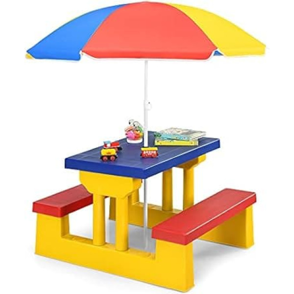 Giantex Children's Seating Set with Parasol, Children's Garden Furniture Set, 1 Table and 2 Benches, Children's Furniture Garden Furniture Set, Colourful, Picnic Set Made of Plastic, Seating Set for