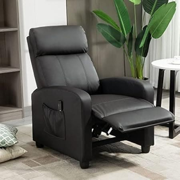 Massage Chair with Two Massage Points and Eight Modes This massage chair has two powerful vibration motors in the back area, which relax your body. With eight massage modes, five adjustable intensity levels and a timer function in two levels, you can meet your individual needs. High comfort: seat, backrest and armrests are padded with thick foam to ensure comfortable sitting and lying down. The chair is covered in faux leather for a luxurious feel. This recliner chair is the perfect addition to your living room, bedroom or home theater and is ideal for resting or watching TV. RELAXED LOUNGING The padded lounger can be adjusted at an angle of up to 150 degrees. Simply push backwards or lean strongly to activate the reclining function. The extendable footrest allows you to fully stretch and relax for maximum comfort. Remote Control & Side Pocket The chair comes with a convenient wired remote control, which allows you to operate conveniently. There is also a side pocket in which you can store the remote control, magazines or other small items. Product specifications: Overall dimensions: 68L x 88W x 98H cm, load capacity: 120kg. Assembly required. › See more product details