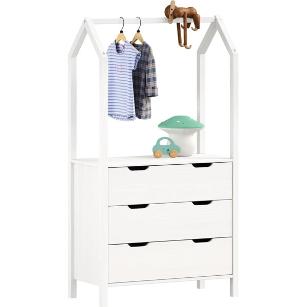 Idimex Amira Children's Bedroom Chest of Drawers with Clothes Rail in House Shape - White, 3 Drawers, Integrated Clothes Rail Storage Space for Clothes, Toys, Books, Pine