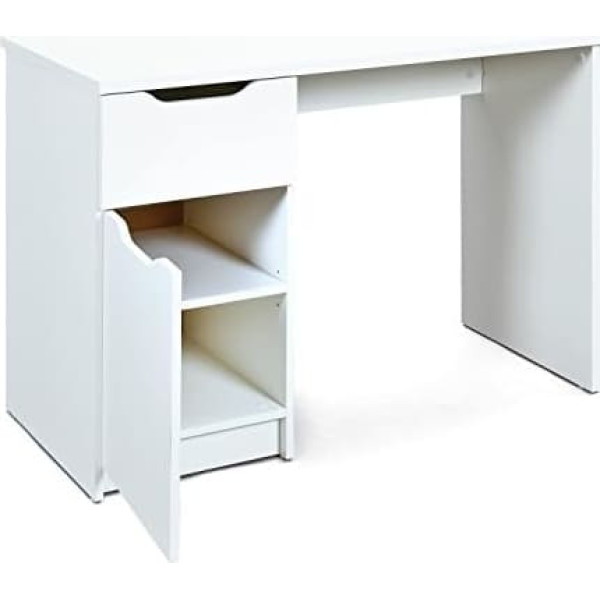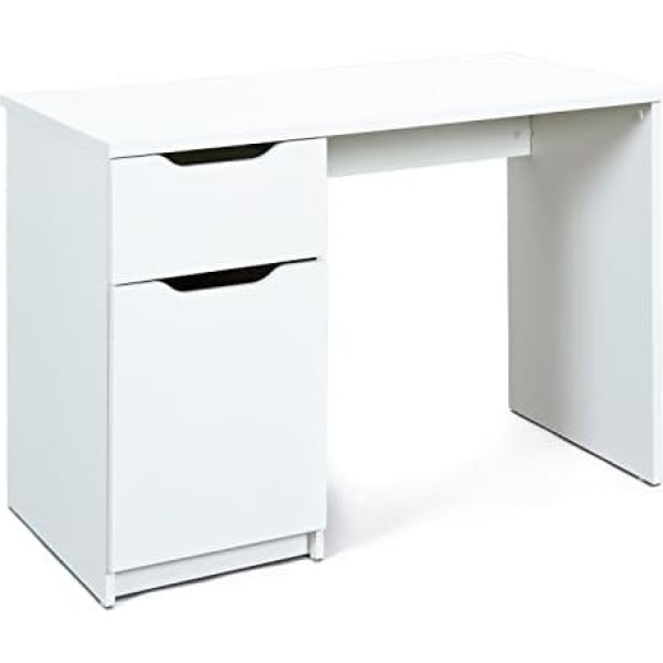 Spacious desk, equipped with a drawer and two compartments hidden by a door to conveniently place your items, white color Its melamine composition guarantees moisture and scratch resistance as well as durability and resistance Its simple lines allow you to place this desk in any desired setting, from the classic office to the modern space Opening the drawers is facilitated by the practical handles embedded in the front part of the drawers and the durable metal guides Dimensions: 115 x 76 x 55 cm › See more product details