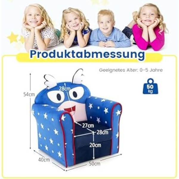 Gentle touch: This children's sofa is covered with a soft, skin-friendly, breathable, cosy velvet surface to give your toddler a comfortable feeling. The patterns on the surface add more fun. Comfortable seating feeling: the chair has an ergonomic and wide backrest that adapts seamlessly to the child's back. The wide curved armrests and large seat provide comfort and support for children. Stable and safe design: supported by a sturdy wooden frame, this preschool children's sofa can hold up to 50 kg. The non-slip and scratch-resistant foot pads improve stability and protect the floor. Perfect gift: this versatile children's chair provides a cosy space for reading, resting, playing etc. The adorable pattern design also makes it a great decoration for the playroom, children's room and more. Lightweight design: with a net weight of only 5 kg, this children's couch is lightweight and easy to move by your child to any place. In addition, the toddler sofa requires no assembly and can be used immediately. › See more product details; Product description Description: The children's sofa is available in different designs. These vibrant and fun patterns will instantly capture your child's imagination and make sitting down an exciting adventure. This children's sofa is not only visually appealing, but also comfortable and stable. The super soft velvet fabric, ergonomic backrest, thick padded seat cushion and wide armrests provide your child support for the spine, arms, back and legs. The upholstered armrest sofa is equipped with a solid wooden frame, ensuring stability and durability. In addition, the sofa has no sharp corners to ensure the safety of your child. Features: Solid wooden frame offers a high load capacity of up to 50 kg. Wide and ergonomic backrest gives your child strong spine support. Skin-friendly and ultra-soft velvet cover with cute patterns Wide armrests provide better relaxation for children's arms Thick seat cushion with high density foam padding provides high comfort Ideal for reading, relaxing, playing games or watching TV Lightweight and compact design with 5 kg weight for easy movement Perfect birthday or holiday gift for children aged up to 5 years Non-slip foot pads prevent scratches on the floor. Technical data: Colour: Blue/Grey/Pink/Multi Material: solid wood, MDF, foam, polyester fabric. Product dimensions: 50 cm x 40 cm x 54 cm (L x W x H). Seat size: 28 cm x 27 cm (L x W x H). Seat height: 20 cm. Net weight: 5 kg. Load capacity: 50 kg. Recommended age: baby up to 5 years old Box contents: 1 x children's sofa. 1 x instruction manual; Product description Description: The children's sofa is available in different designs. These vibrant and fun patterns will instantly capture your child's imagination and make sitting down an exciting adventure. This children's sofa is not only visually appealing, but also comfortable and stable. The super soft velvet fabric, ergonomic backrest, thick padded seat cushion and wide armrests provide your child support for the spine, arms, back and legs. The upholstered armrest sofa is equipped with a solid wooden frame, ensuring stability and durability. In addition, the sofa has no sharp corners to ensure the safety of your child. Features: Solid wooden frame offers a high load capacity of up to 50 kg. Wide and ergonomic backrest gives your child strong spine support. Skin-friendly and ultra-soft velvet cover with cute patterns Wide armrests provide better relaxation for children's arms Thick seat cushion with high density foam padding provides high comfort Ideal for reading, relaxing, playing games or watching TV Lightweight and compact design with 5 kg weight for easy movement Perfect birthday or holiday gift for children aged up to 5 years Non-slip foot pads prevent scratches on the floor. Technical data: Colour: Blue/Grey/Pink/Multi Material: solid wood, MDF, foam, polyester fabric. Product dimensions: 50 cm x 40 cm x 54 cm (L x W x H). Seat size: 28 cm x 27 cm (L x W x H). Seat height: 20 cm. Net weight: 5 kg. Load capacity: 50 kg. Recommended age: baby up to 5 years old Box contents: 1 x children's sofa. 1 x instruction manual; Description: The children's sofa is available in different designs. These vibrant and fun patterns will instantly capture your child's imagination and make sitting down an exciting adventure. This children's sofa is not only visually appealing, but also comfortable and stable. The super soft velvet fabric, ergonomic backrest, thick padded seat cushion and wide armrests provide your child support for the spine, arms, back and legs. The upholstered armrest sofa is equipped with a solid wooden frame, ensuring stability and durability. In addition, the sofa has no sharp corners to ensure the safety of your child. Features: Solid wooden frame offers a high load capacity of up to 50 kg. Wide and ergonomic backrest gives your child strong spine support. Skin-friendly and ultra-soft velvet cover with cute patterns Wide armrests provide better relaxation for children's arms Thick seat cushion with high density foam padding provides high comfort Ideal for reading, relaxing, playing games or watching TV Lightweight and compact design with 5 kg weight for easy movement Perfect birthday or holiday gift for children aged up to 5 years Non-slip foot pads prevent scratches on the floor. Technical data: Colour: Blue/Grey/Pink/Multi Material: solid wood, MDF, foam, polyester fabric. Product dimensions: 50 cm x 40 cm x 54 cm (L x W x H). Seat size: 28 cm x 27 cm (L x W x H). Seat height: 20 cm. Net weight: 5 kg. Load capacity: 50 kg. Recommended age: baby up to 5 years old Box contents: 1 x children's sofa. 1 x instruction manual