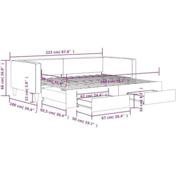This 2-in-1 pull-out daybed, which doubles as a sofa and a bed, is a practical and eye-catching addition to your living room or bedroom. Versatile day bed: The sofa bed acts as a sofa during the day and can be easily transformed into a double bed at night by removing the roller box - a practical solution to provide guests with a comfortable sleeping place and maximise space. Ample storage space: This guest bed has two drawers with wheels that provide ample storage space for clothes, socks, toys, pillows, etc. Durable fabric and robust construction: This day bed sofa has a sturdy wooden and metal frame and is covered with durable and comfortable fabric. Good to know: The mattresses are not included with this bed. However, we offer a wide range of mattresses. You can search for matching mattresses in our shop. › See more product details; Product description This 2-in-1 pull-out daybed, which doubles as a sofa and a bed, is a practical and eye-catching addition to your living room or bedroom. VERSATILE DAYBED - The sofa bed acts as a sofa during the day and easily converts into a double bed at night by pulling out the rolling box - a practical solution to provide guests with a comfortable sleeping space and maximising space. Ample Storage Space This guest bed features two drawers with wheels that provide ample storage space for clothes, socks, toys, pillows, etc. DURABLE FABRIC & DURABLE CONSTRUCTION: This day bed sofa has a sturdy wooden and metal frame and is covered with durable and comfortable fabric. Good to know: The mattresses are not included with this bed. However, we offer a wide range of mattresses. You can search for matching mattresses in our shop. Colour: light grey. Material: fabric (100% polyester), metal, solid wood, wood material. Material of the slats: plywood. Filling: foam. Dimensions (unextended): 223 x 100 x 68 cm (L x W x H). Dimensions (extended): 223 x 192.5 x 68 cm (L x W x H). Bed Drawer Dimensions (each): 67 x 50 x 16 cm (L x W x H) Armrest height from floor: 68 cm. Foot height: 15 cm. Suitable mattress size: 90 x 200 cm (W x L) Required: 2 x Mattress (Not Included) Assembly Required: Yes Package includes: 1 x pull-out day bed. 2 x bed drawers.; Product description This 2-in-1 pull-out daybed, which doubles as a sofa and a bed, is a practical and eye-catching addition to your living room or bedroom. VERSATILE DAYBED - The sofa bed acts as a sofa during the day and easily converts into a double bed at night by pulling out the rolling box - a practical solution to provide guests with a comfortable sleeping space and maximising space. Ample Storage Space This guest bed features two drawers with wheels that provide ample storage space for clothes, socks, toys, pillows, etc. DURABLE FABRIC & DURABLE CONSTRUCTION: This day bed sofa has a sturdy wooden and metal frame and is covered with durable and comfortable fabric. Good to know: The mattresses are not included with this bed. However, we offer a wide range of mattresses. You can search for matching mattresses in our shop. Colour: light grey. Material: fabric (100% polyester), metal, solid wood, wood material. Material of the slats: plywood. Filling: foam. Dimensions (unextended): 223 x 100 x 68 cm (L x W x H). Dimensions (extended): 223 x 192.5 x 68 cm (L x W x H). Bed Drawer Dimensions (each): 67 x 50 x 16 cm (L x W x H) Armrest height from floor: 68 cm. Foot height: 15 cm. Suitable mattress size: 90 x 200 cm (W x L) Required: 2 x Mattress (Not Included) Assembly Required: Yes Package includes: 1 x pull-out day bed. 2 x bed drawers.; This 2-in-1 pull-out daybed, which doubles as a sofa and a bed, is a practical and eye-catching addition to your living room or bedroom. VERSATILE DAYBED - The sofa bed acts as a sofa during the day and easily converts into a double bed at night by pulling out the rolling box - a practical solution to provide guests with a comfortable sleeping space and maximising space. Ample Storage Space This guest bed features two drawers with wheels that provide ample storage space for clothes, socks, toys, pillows, etc. DURABLE FABRIC & DURABLE CONSTRUCTION: This day bed sofa has a sturdy wooden and metal frame and is covered with durable and comfortable fabric. Good to know: The mattresses are not included with this bed. However, we offer a wide range of mattresses. You can search for matching mattresses in our shop. Colour: light grey. Material: fabric (100% polyester), metal, solid wood, wood material. Material of the slats: plywood. Filling: foam. Dimensions (unextended): 223 x 100 x 68 cm (L x W x H). Dimensions (extended): 223 x 192.5 x 68 cm (L x W x H). Bed Drawer Dimensions (each): 67 x 50 x 16 cm (L x W x H) Armrest height from floor: 68 cm. Foot height: 15 cm. Suitable mattress size: 90 x 200 cm (W x L) Required: 2 x Mattress (Not Included) Assembly Required: Yes Package includes: 1 x pull-out day bed. 2 x bed drawers.