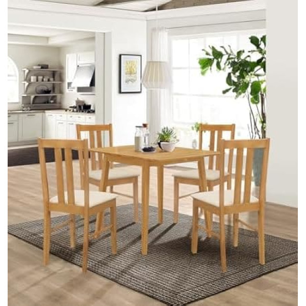 Durability | Hallowood dining table set is made of rubber wood for chairs and table legs and painted MDF for tabletop. It has a sturdy frame and a long endurance. Dining room chairs set of 4 have soft seat pads. The dining room set is characterised by strong and robust DESIGN | This placemat of 4 chairs is designed to be ideal for smaller spaces or homes that benefit from space saving furniture. The table has extendable leaves and can form a great sideboard or additional surface on a wall when folded. EASY TO ASSEMBLE | Dining table set comes with all included hardware parts and tools. It requires minimal assembly as only the legs need to be attached with screws. Dimensions for table - H 74 x W 61/97 x D 76 cm, chair - H 89 x W 41 x D 46 cm QUALITY GUARANTEE | Customers receive a free one-year quality guarantee from Hallowood Furniture. MULTIPURPOSE The kitchen table offers foldable side leaves that make it easier to store the chairs under the table to save space. The leaf feature of this folding dining table makes this table unique. › See more product details; Product description Brighten up your dining area with our stunning light oak dining table set. Designed with both style and functionality in mind, this compact table is perfect for homes where space is limited. It blends effortlessly into small spaces, making it an ideal addition to cozy kitchens and dining areas. The table's attractive light oak tone is not only visually appealing, but also versatile, allowing it to seamlessly complement a variety of interiors and color schemes in your home. Paired with the table are two stylish wooden dining chairs, which are also decorated in an elegant light oak tone. Made from solid rubber wood and protected by a durable lacquer finish, these chairs are built to withstand the rigors of everyday use while maintaining their glossy appearance. The warm cream fabric seat pads offer comfort and modern charm, making them perfect for any home decor. The classic yet stylish design on the backrest adds a touch of elegance and makes these chairs adaptable companions for all types of bright furniture. Whether you're enjoying a meal or need an occasional desk, this dining table set promises versatility, durability, and timeless beauty for your home.; Product description Brighten up your dining area with our stunning light oak dining table set. Designed with both style and functionality in mind, this compact table is perfect for homes where space is limited. It blends effortlessly into small spaces, making it an ideal addition to cozy kitchens and dining areas. The table's attractive light oak tone is not only visually appealing, but also versatile, allowing it to seamlessly complement a variety of interiors and color schemes in your home. Paired with the table are two stylish wooden dining chairs, which are also decorated in an elegant light oak tone. Made from solid rubber wood and protected by a durable lacquer finish, these chairs are built to withstand the rigors of everyday use while maintaining their glossy appearance. The warm cream fabric seat pads offer comfort and modern charm, making them perfect for any home decor. The classic yet stylish design on the backrest adds a touch of elegance and makes these chairs adaptable companions for all types of bright furniture. Whether you're enjoying a meal or need an occasional desk, this dining table set promises versatility, durability, and timeless beauty for your home.; Brighten up your dining area with our stunning light oak dining table set. Designed with both style and functionality in mind, this compact table is perfect for homes where space is limited. It blends effortlessly into small spaces, making it an ideal addition to cozy kitchens and dining areas. The table's attractive light oak tone is not only visually appealing, but also versatile, allowing it to seamlessly complement a variety of interiors and color schemes in your home. Paired with the table are two stylish wooden dining chairs, which are also decorated in an elegant light oak tone. Made from solid rubber wood and protected by a durable lacquer finish, these chairs are built to withstand the rigors of everyday use while maintaining their glossy appearance. The warm cream fabric seat pads offer comfort and modern charm, making them perfect for any home decor. The classic yet stylish design on the backrest adds a touch of elegance and makes these chairs adaptable companions for all types of bright furniture. Whether you're enjoying a meal or need an occasional desk, this dining table set promises versatility, durability, and timeless beauty for your home.