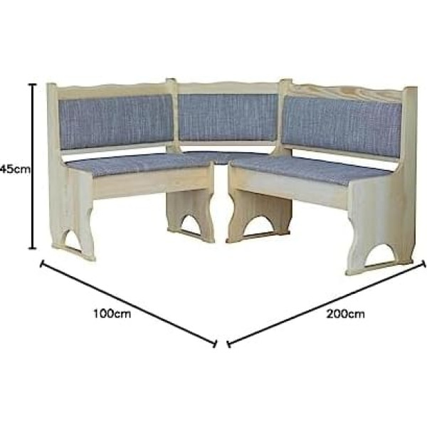 Corner bench › See more product details; Product description The corner sofa is made entirely of pine wood. Each piece of furniture is made by hand, so it is always very thoroughly and carefully processed. The corner sofa is robust and fits perfectly with the kitchen or dining room. There is a shelf under the seat. All necessary parts for mounting the corner sofa are included. The corner bench is painted pine - the corner bench is coated with colourless varnish. Beige version. Dimensions corner sofa length (side X) and width (side Y): 140 x 100 cm (measured on the wall) height: 86 cm height to top of seat surface: 45 cm width of the seat surface: 36 cm depth of the compartments in the seat: 12 cm. You can set up the corner bench in both directions.; Product description The corner sofa is made entirely of pine wood. Each piece of furniture is made by hand, so it is always very thoroughly and carefully processed. The corner sofa is robust and fits perfectly with the kitchen or dining room. There is a shelf under the seat. All necessary parts for mounting the corner sofa are included. The corner bench is painted pine - the corner bench is coated with colourless varnish. Beige version. Dimensions corner sofa length (side X) and width (side Y): 140 x 100 cm (measured on the wall) height: 86 cm height to top of seat surface: 45 cm width of the seat surface: 36 cm depth of the compartments in the seat: 12 cm. You can set up the corner bench in both directions.; The corner sofa is made entirely of pine wood. Each piece of furniture is made by hand, so it is always very thoroughly and carefully processed. The corner sofa is robust and fits perfectly with the kitchen or dining room. There is a shelf under the seat. All necessary parts for mounting the corner sofa are included. The corner bench is painted pine - the corner bench is coated with colourless varnish. Beige version. Dimensions corner sofa length (side X) and width (side Y): 140 x 100 cm (measured on the wall) height: 86 cm height to top of seat surface: 45 cm width of the seat surface: 36 cm depth of the compartments in the seat: 12 cm. You can set up the corner bench in both directions.