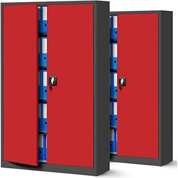 Set of 2 filing cabinets XXL (powder-coated), colour: anthracite/red: RAL: 7016 - 3020, dimensions: 185 cm x 115 cm x 45 cm (height x width x depth) Robust construction and high-quality workmanship, material thickness: 0.6 mm, push rod lock with twist handle and two keys. 2 reinforced double doors (opening angle: approx. 110°), 4 adjustable shelves in the grid of 25 mm, load capacity per shelf: approx. 50 kg. Easy integration into the following applications: archives, schools, industrial companies, administrations, authorities, workshops, cooperatives, garages, basements, etc. Please note that after purchase a valid phone number must be stored when the goods are delivered, so that the forwarding company can notify you by phone as soon as possible. If an incorrect/invalid phone number is stored, the shipment or delivery of your order will be delayed by a few days. › See more product details