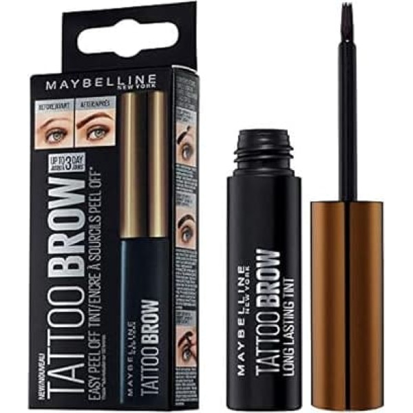 Eyebrow tint, peel-off long-wearing tattoo brow formula, peel off tint (protective lacquer) is correctable, which is perfect during application for drawing. Tattoo effect natural weakens gradually after 3 days. Result: A simple formula to use. It is easy to use and can be corrected while applying for drawing perfectly. › See more product details; Product description Product Description With the new Tattoo Brow Peel Off Eyebrow Gel Tint from Maybelline, you wake up with evenly filled brows. Gone are the days of excessive plucking and pulling thin pencil lines - beautiful, dense eyebrows are back and everyone wants to join in this beauty trend! Our semi-permanent eyebrow gel is an easy alternative to eyebrow colouring and leaves your eyebrows looking natural full for up to 3 days - and all from the comfort of your home. Easy to use in just 3 steps, simply apply the gel to the desired shape, cure and peel off with your fingers - no need to visit the salon! Directions 1. Apply the gel to clean eyebrows using the brush, correct any errors before it dries, leave on for at least 20 minutes, then pull off from the inner corner of each eyebrow. 2. For maximum hold, let it dry for up to 2 hours, the formula is smudge-proof, transfer-proof and waterproof, do not use peeling or harsh chemicals for longer hold.; Product description Product Description With the new Tattoo Brow Peel Off Eyebrow Gel Tint from Maybelline, you wake up with evenly filled brows. Gone are the days of excessive plucking and pulling thin pencil lines - beautiful, dense eyebrows are back and everyone wants to join in this beauty trend! Our semi-permanent eyebrow gel is an easy alternative to eyebrow colouring and leaves your eyebrows looking natural full for up to 3 days - and all from the comfort of your home. Easy to use in just 3 steps, simply apply the gel to the desired shape, cure and peel off with your fingers - no need to visit the salon! Directions 1. Apply the gel to clean eyebrows using the brush, correct any errors before it dries, leave on for at least 20 minutes, then pull off from the inner corner of each eyebrow. 2. For maximum hold, let it dry for up to 2 hours, the formula is smudge-proof, transfer-proof and waterproof, do not use peeling or harsh chemicals for longer hold.; Product Description With the new Tattoo Brow Peel Off Eyebrow Gel Tint from Maybelline, you wake up with evenly filled brows. Gone are the days of excessive plucking and pulling thin pencil lines - beautiful, dense eyebrows are back and everyone wants to join in this beauty trend! Our semi-permanent eyebrow gel is an easy alternative to eyebrow colouring and leaves your eyebrows looking natural full for up to 3 days - and all from the comfort of your home. Easy to use in just 3 steps, simply apply the gel to the desired shape, cure and peel off with your fingers - no need to visit the salon! Directions 1. Apply the gel to clean eyebrows using the brush, correct any errors before it dries, leave on for at least 20 minutes, then pull off from the inner corner of each eyebrow. 2. For maximum hold, let it dry for up to 2 hours, the formula is smudge-proof, transfer-proof and waterproof, do not use peeling or harsh chemicals for longer hold.