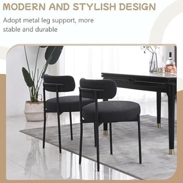 Aisall Black Dining Room Chairs, Set of 2, Round Upholstered Boucle Dining Room Chairs, Mid Century, Modern Kitchen Chairs, Curved Backrest Chairs for Dining Room, Black Metal Legs