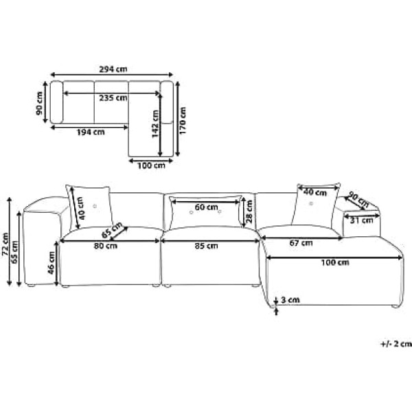 Modern corner couch with deep seat and 3 decorative cushions Soft polyester padding in classic light beige Sturdy wooden construction, sturdy plastic legs Impressed by its stylish and cosy appearance Ideal addition to any modern, traditional or minimalist living room › See more product details; Product description Modern light beige corner sofa with deep seat and 3 decorative cushions. Shapely beauty that invites you to sit and lie down particularly relaxed with soft and very thick padding. The clean lines and simple design of the corner couch are complemented by three cushions. This brings a completely new, homely charm and harmonious elegance into the room. Make yourself comfortable, close your eyes and let yourself be seduced by the special comfort of the sofa into a world of relaxation. Details: Type: Corner Sofa Style: Modern Colour: beige, black. Colour: light beige. Material type: fabric. Material: polyester. Additional material: plastic. Filling material: foam. Composition: 100% polyester. Shape: L-shaped Armrests: straight. Armrests: yes. Back with padded cover: yes. Orientation: Left Hand Pattern: No Pattern Seat construction: wave suspension. Foam density: 24 kg/m3. Number of seats: 3 people. Dimensions: Armrest height: 65 cm. Depth: 170 cm. Cushion thickness: 43 cm. Seat height: 46 cm. Width: 294 cm. Height: 72 cm. Seat: 235 x 65 cm. Weight: 80 kg. Max. Maximum load: 150 kg. You are buying: 1 x corner sofa, 3 x cushions. Product advantages: Relaxed sitting position, perfectly shaped armrests, sturdy construction of the frame, easy-care and durable material, removable covers, all-round cover and therefore freely adjustable in the room, protective caps to protect the floor, attached modules with connectors on the bottom. Installation: Partially assembled. 20 - 40 minutes.; Product description Modern light beige corner sofa with deep seat and 3 decorative cushions. Shapely beauty that invites you to sit and lie down particularly relaxed with soft and very thick padding. The clean lines and simple design of the corner couch are complemented by three cushions. This brings a completely new, homely charm and harmonious elegance into the room. Make yourself comfortable, close your eyes and let yourself be seduced by the special comfort of the sofa into a world of relaxation. Details: Type: Corner Sofa Style: Modern Colour: beige, black. Colour: light beige. Material type: fabric. Material: polyester. Additional material: plastic. Filling material: foam. Composition: 100% polyester. Shape: L-shaped Armrests: straight. Armrests: yes. Back with padded cover: yes. Orientation: Left Hand Pattern: No Pattern Seat construction: wave suspension. Foam density: 24 kg/m3. Number of seats: 3 people. Dimensions: Armrest height: 65 cm. Depth: 170 cm. Cushion thickness: 43 cm. Seat height: 46 cm. Width: 294 cm. Height: 72 cm. Seat: 235 x 65 cm. Weight: 80 kg. Max. Maximum load: 150 kg. You are buying: 1 x corner sofa, 3 x cushions. Product advantages: Relaxed sitting position, perfectly shaped armrests, sturdy construction of the frame, easy-care and durable material, removable covers, all-round cover and therefore freely adjustable in the room, protective caps to protect the floor, attached modules with connectors on the bottom. Installation: Partially assembled. 20 - 40 minutes.; Modern light beige corner sofa with deep seat and 3 decorative cushions. Shapely beauty that invites you to sit and lie down particularly relaxed with soft and very thick padding. The clean lines and simple design of the corner couch are complemented by three cushions. This brings a completely new, homely charm and harmonious elegance into the room. Make yourself comfortable, close your eyes and let yourself be seduced by the special comfort of the sofa into a world of relaxation. Details: Type: Corner Sofa Style: Modern Colour: beige, black. Colour: light beige. Material type: fabric. Material: polyester. Additional material: plastic. Filling material: foam. Composition: 100% polyester. Shape: L-shaped Armrests: straight. Armrests: yes. Back with padded cover: yes. Orientation: Left Hand Pattern: No Pattern Seat construction: wave suspension. Foam density: 24 kg/m3. Number of seats: 3 people. Dimensions: Armrest height: 65 cm. Depth: 170 cm. Cushion thickness: 43 cm. Seat height: 46 cm. Width: 294 cm. Height: 72 cm. Seat: 235 x 65 cm. Weight: 80 kg. Max. Maximum load: 150 kg. You are buying: 1 x corner sofa, 3 x cushions. Product advantages: Relaxed sitting position, perfectly shaped armrests, sturdy construction of the frame, easy-care and durable material, removable covers, all-round cover and therefore freely adjustable in the room, protective caps to protect the floor, attached modules with connectors on the bottom. Installation: Partially assembled. 20 - 40 minutes.