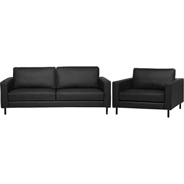 High quality living room set in black with removable pillowcases Cover: split leather, PVC and polyester, legs: metal, construction: eucalyptus wood Impress with its inimitable elegance Particularly inviting and comfortable thanks to its deep shape Includes assembly instructions for easy self-assembly › See more product details; Product description Product description Modern black sofa and armchair set with split leather cover. Thanks to the wide, deep and very soft seats of this living room set, you can always expect maximum seating comfort. Their classic shape and shiny look radiate a subtle elegance in the room. This furniture is perfect in any modern decor, but its true beauty is expressed above all in a Scandinavian or minimalist style. Details: Type: seating set. Style: Industrial Colour: black. Material Type: Genuine Leather Material: Genuine Leather Additional material: metal. Filling material: foam. Armrests: straight. Seat construction: wave suspension. Foam density: 24 kg/m3. Number of seats: 4 people. Dimensions: Sofa 3-seater: 91x204x87 Armchair: 91x117x87. Cushion thickness: 14 cm. Seat height: 42 cm. Total dimensions: 204 x 91 x 87. Weight: 75 kg. Max. Maximum load: 150 kg. You are buying: 1 x three-seater, 1 x armchair. Product advantages: Secure and easy attachment of the cushions thanks to practical Velcro fasteners, thick padding for maximum comfort, timeless design, stable construction of the frame, all-round cover and therefore can be placed freely in the room. Installation: Legs / feet not assembled. 20 - 40 minutes. Safety Warning Achtung: Dieses Produkt enthält scharfe Kanten oder kleine Teile, die für Kinder oder Haustiere gefährlich sein können. Bitte montieren Sie das Produkt sorgfältig und bewahren Sie es an einem sicheren Ort auf. Halten Sie das Produkt fern von offenen Flammen oder hohen Hitzequellen, da es leicht entflammbar sein kann.; Product description Product description Modern black sofa and armchair set with split leather cover. Thanks to the wide, deep and very soft seats of this living room set, you can always expect maximum seating comfort. Their classic shape and shiny look radiate a subtle elegance in the room. This furniture is perfect in any modern decor, but its true beauty is expressed above all in a Scandinavian or minimalist style. Details: Type: seating set. Style: Industrial Colour: black. Material Type: Genuine Leather Material: Genuine Leather Additional material: metal. Filling material: foam. Armrests: straight. Seat construction: wave suspension. Foam density: 24 kg/m3. Number of seats: 4 people. Dimensions: Sofa 3-seater: 91x204x87 Armchair: 91x117x87. Cushion thickness: 14 cm. Seat height: 42 cm. Total dimensions: 204 x 91 x 87. Weight: 75 kg. Max. Maximum load: 150 kg. You are buying: 1 x three-seater, 1 x armchair. Product advantages: Secure and easy attachment of the cushions thanks to practical Velcro fasteners, thick padding for maximum comfort, timeless design, stable construction of the frame, all-round cover and therefore can be placed freely in the room. Installation: Legs / feet not assembled. 20 - 40 minutes. Safety Warning Achtung: Dieses Produkt enthält scharfe Kanten oder kleine Teile, die für Kinder oder Haustiere gefährlich sein können. Bitte montieren Sie das Produkt sorgfältig und bewahren Sie es an einem sicheren Ort auf. Halten Sie das Produkt fern von offenen Flammen oder hohen Hitzequellen, da es leicht entflammbar sein kann.; Product description Modern black sofa and armchair set with split leather cover. Thanks to the wide, deep and very soft seats of this living room set, you can always expect maximum seating comfort. Their classic shape and shiny look radiate a subtle elegance in the room. This furniture is perfect in any modern decor, but its true beauty is expressed above all in a Scandinavian or minimalist style. Details: Type: seating set. Style: Industrial Colour: black. Material Type: Genuine Leather Material: Genuine Leather Additional material: metal. Filling material: foam. Armrests: straight. Seat construction: wave suspension. Foam density: 24 kg/m3. Number of seats: 4 people. Dimensions: Sofa 3-seater: 91x204x87 Armchair: 91x117x87. Cushion thickness: 14 cm. Seat height: 42 cm. Total dimensions: 204 x 91 x 87. Weight: 75 kg. Max. Maximum load: 150 kg. You are buying: 1 x three-seater, 1 x armchair. Product advantages: Secure and easy attachment of the cushions thanks to practical Velcro fasteners, thick padding for maximum comfort, timeless design, stable construction of the frame, all-round cover and therefore can be placed freely in the room. Installation: Legs / feet not assembled. 20 - 40 minutes. Safety Warning Achtung: Dieses Produkt enthält scharfe Kanten oder kleine Teile, die für Kinder oder Haustiere gefährlich sein können. Bitte montieren Sie das Produkt sorgfältig und bewahren Sie es an einem sicheren Ort auf. Halten Sie das Produkt fern von offenen Flammen oder hohen Hitzequellen, da es leicht entflammbar sein kann.