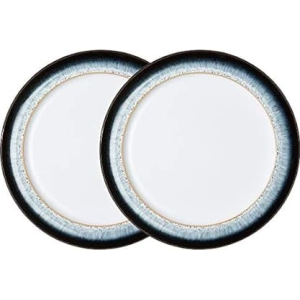 SET OF 2 MEDIUM PLATES This set includes 2 lunch plates (24.5cm diameter). These plates are ideal as side dish, dessert or salad plates. HANDMADE IN ENGLAND Handmade in the Denby Pottery in England from high quality, locally sourced clay. Each item is touched by at least 20 pairs of hands during the manufacturing process in our 200 year old factory in the UK. DURABLE AND VERSATILE STONEWARE This plate set has been expertly glazed to prevent chipping and increase durability. Our ranges are versatile and multifunctional - perfect for everyday use or for special occasions - so a smaller quantity is required. OVEN, MICROWAVE, DISHWASHER & FREEZER SAFE This set can be safely used in the oven, dishwasher, freezer and microwave, which means you can cook your food in the same pot you serve it in, then save the leftovers and reheat it the next day...save time and money. UNIQUE ICING The colors and effects of the stunning glazes on Halo create a unique, eye-catching speckled finish. This design features black, grey and white colors with shades of blue. BUY WELL, BUY ONCE: Denby manufactured products are made to last. OUR PRODUCTS ARE SUSTAINABLY MANUFACTURED - We are proudly the first UK tableware manufacturer able to claim \