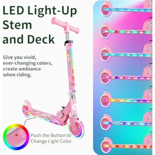 LED scooter for children: The children's scooter has bright LED wheels that do not require batteries. The lights become brighter the faster the child drives. With battery-operated LED lights on the T-stem and deck that can be switched on and off, 7 colour changing modes create lighting effects. Children will love this special feature that makes scooter unique Put driving at night in safety and enjoy it even more Adjustable and stable: With flexible height adjustment function, the city scooter grows with the child's body size, it is height adjustable between 78 – 88 cm. Adjust the most suitable height anytime and anywhere. Let the scooter accompany the children through the whole happy childhood. Designed for children aged 3 – 12 years, under 62 inches tall. Foldable and lightweight: Beleev V2 scooter for children easy to fold and unfold in seconds, easy to use, easy to carry, it weighs only 7.6 pounds. Bring cool scooters with you and let the children slide confidently and cheerfully in skateparks or on the street. Pleasant and comfortable ride: The children's 2 wheels scooter is equipped with 120 mm wheels and low-friction ABEC-7 ball bearings, which ensure a much safer and smoother ride on uneven pavements or rough road surfaces. Integrated rubber handlebar grips ensure comfort, stability and are not quickly worn out. The extra wide and lowered deck allows easier and faster glide over paved surfaces, crevices and more. Better durable and safe: The children's scooter is designed to withstand use and mistreatment by children and supports riders weighing up to 50 kg (110 lbs). The long rear mudguard brake stops the scooter efficiently when braking is carried out and extends the life of the wheels. The children's scooter deck has non-slip grip tape for safe driving, better control and safe driving as well as a pattern design for added flair. › See more product details