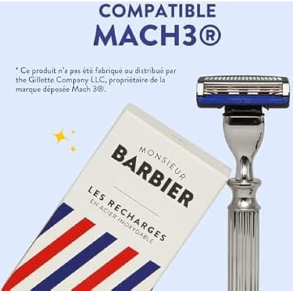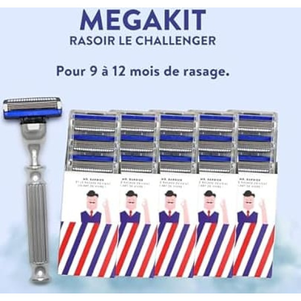 THE TOTAL: Includes a shaving handle and 20 blade cartridges for 6 to 12 months of shaving at a fraction price. Handle design: stainless steel handle with timeless design. Finally an elegant razor for your bathroom! Compatible with handles and MACH3 refills only. 【3 Sharp Blades】4 disposable shaving cartridges with 3 blades and 40° rotating head, for a gentle mechanical shave, perfect for sensitive skin. Let's Control! Ideal for sensitive skin: double wide lubricating strips with super protection against irritation for a smooth and soothing glide. French brand: We are a small French company that pays great attention to the satisfaction of its customers. That's why we invite you to contact us if you have any questions, suggestions or even a hello! › See more product details; Product description The men's razor with 3 blades with 20 refills from Mr. Barber, offered in the Le Challenger manual shaving set is specially designed for sensitive skin and for those looking for an effective as well as gentle shave. This complete set includes a shaving handle and 20 blade cartridges that provide 6 to 12 months of shaving at an affordable price. The stainless steel handle in a timeless design gives your bathroom an elegant touch. Designed for optimal grip, it is exclusively compatible with MACH3 handles and refills. The 3 sharp blade shaving system features anti-friction technology that allows for a precise and smooth cut while minimising irritation thanks to a 40° rotating head that adapts perfectly to the contours of the face for a close and gentle shave. This razor is ideal for sensitive skin thanks to its double lubricating strips enriched with a super protection system against irritation that ensures a smooth and soothing glide over the skin, significantly reducing the risk of redness and cuts. Whether you are a beginner or an expert in shaving, this set is perfect for achieving a flawless result without compromising the comfort of your skin. In addition to the high-quality shave, MONSIEUR BARBIER is proud to be a French brand that cares about the satisfaction of its customers. As a small business, we are committed to providing you with personalized and listening service. Do not hesitate to contact us with any questions, suggestions or just to exchange with us. Your comfort and satisfaction are our priority, and we are committed to providing you with a powerful, comfortable shave with every use. Trust the LE CHALLENGER razor for a gentle, effective and always flawless shave.; Product description The men's razor with 3 blades with 20 refills from Mr. Barber, offered in the Le Challenger manual shaving set is specially designed for sensitive skin and for those looking for an effective as well as gentle shave. This complete set includes a shaving handle and 20 blade cartridges that provide 6 to 12 months of shaving at an affordable price. The stainless steel handle in a timeless design gives your bathroom an elegant touch. Designed for optimal grip, it is exclusively compatible with MACH3 handles and refills. The 3 sharp blade shaving system features anti-friction technology that allows for a precise and smooth cut while minimising irritation thanks to a 40° rotating head that adapts perfectly to the contours of the face for a close and gentle shave. This razor is ideal for sensitive skin thanks to its double lubricating strips enriched with a super protection system against irritation that ensures a smooth and soothing glide over the skin, significantly reducing the risk of redness and cuts. Whether you are a beginner or an expert in shaving, this set is perfect for achieving a flawless result without compromising the comfort of your skin. In addition to the high-quality shave, MONSIEUR BARBIER is proud to be a French brand that cares about the satisfaction of its customers. As a small business, we are committed to providing you with personalized and listening service. Do not hesitate to contact us with any questions, suggestions or just to exchange with us. Your comfort and satisfaction are our priority, and we are committed to providing you with a powerful, comfortable shave with every use. Trust the LE CHALLENGER razor for a gentle, effective and always flawless shave.; The men's razor with 3 blades with 20 refills from Mr. Barber, offered in the Le Challenger manual shaving set is specially designed for sensitive skin and for those looking for an effective as well as gentle shave. This complete set includes a shaving handle and 20 blade cartridges that provide 6 to 12 months of shaving at an affordable price. The stainless steel handle in a timeless design gives your bathroom an elegant touch. Designed for optimal grip, it is exclusively compatible with MACH3 handles and refills. The 3 sharp blade shaving system features anti-friction technology that allows for a precise and smooth cut while minimising irritation thanks to a 40° rotating head that adapts perfectly to the contours of the face for a close and gentle shave. This razor is ideal for sensitive skin thanks to its double lubricating strips enriched with a super protection system against irritation that ensures a smooth and soothing glide over the skin, significantly reducing the risk of redness and cuts. Whether you are a beginner or an expert in shaving, this set is perfect for achieving a flawless result without compromising the comfort of your skin. In addition to the high-quality shave, MONSIEUR BARBIER is proud to be a French brand that cares about the satisfaction of its customers. As a small business, we are committed to providing you with personalized and listening service. Do not hesitate to contact us with any questions, suggestions or just to exchange with us. Your comfort and satisfaction are our priority, and we are committed to providing you with a powerful, comfortable shave with every use. Trust the LE CHALLENGER razor for a gentle, effective and always flawless shave.