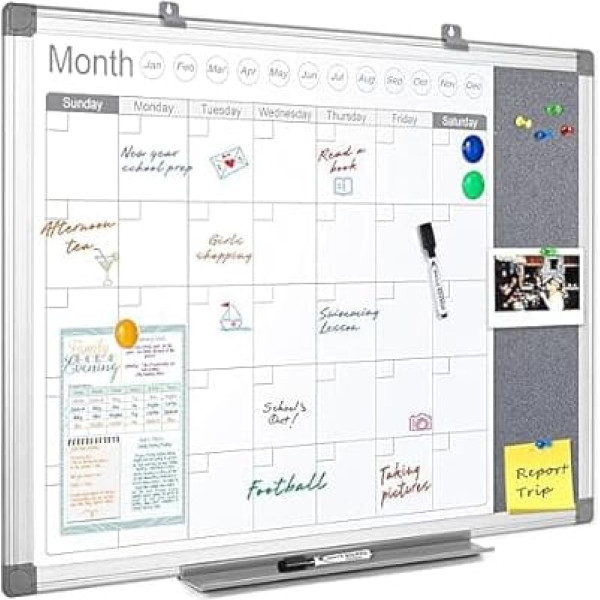 Smooth and Magnetic Surface - The surface is durable for writing, you can write notes or reminders and wipe completely clean without leaving any stains. Simply use all magnets to attach all your notes, memos, pictures, menus or reminders to the surface of the whiteboard. Felt Strip Design - The felt strip parts can use pens to fix notes, pictures, menus, calendars, reminders and more. Monthly Calendar Design — The simple calendar design allows you to check the plan at a glance. The perfect dry erase monthly calendar is convenient for busy people to create and track monthly or weekly schedules, to-do lists and housework organisation. Wall-mounted design: sturdy silver aluminium frame and ABS plastic corners, no worry about breaking or sharp edges. It comes with 4 screws and 4 hooks, you can choose whether you use screws to nail the planning board on the wall or use hooks for hanging. ACCESSORIES - Includes 1 x Wall Planner, 1 x Pen Tray, 2 x Dry Erase Markers (Black), 3 x Manets (Random Color), 6 x Pins (Random Color), 8 x Screw Fixings and 4 x Corner Covers › See more product details; Product description SwanSea always focuses on providing a multifunctional writing solution for customers. Product features: Smooth & magnetic surface: easy to write on and wipe clean completely clean, suitable for dry erase board. Monthly calendar design: write data, take notes or plan immediately, help you work more efficiently. 3 in 1 combination calendar plate: attach light sheets to the magnetic board with the magnets. The cork strip is convenient for attaching pictures, quick notes and reminders. Perfect size: 60 x 45 cm and 90 x 60 cm, good size for personal use (landscape / horizontal orientation only). Wall mounted design: silver aluminium frame and ABS plastic corner with screw fixing in corners, easy to install on the wall. Pen tray clips: on the bottom of the board to hold pens, accessories and eraser. Multifunctional use: perfect for planning, education, presentation and organization. Suitable for home, refrigerator, office, cubicle, desk, class, school, college, dormitory, kitchen, changing room, children's room or any other place. Great help for managers, teachers, students and children. Box contents: 1 x Wall Planner 1 x Pen Tray 2 x Dry Erase Markers (Black) 3 x Manets (Random Color) 6 x Push Pins (Random Color) 8 x screw fixings and 4 x corner covers. SwanSea If for any reason you are not satisfied with any SwanSea product, please do not hesitate to contact us and we will do our best to solve your problem as soon as possible! Click the \; Product description SwanSea always focuses on providing a multifunctional writing solution for customers. Product features: Smooth & magnetic surface: easy to write on and wipe clean completely clean, suitable for dry erase board. Monthly calendar design: write data, take notes or plan immediately, help you work more efficiently. 3 in 1 combination calendar plate: attach light sheets to the magnetic board with the magnets. The cork strip is convenient for attaching pictures, quick notes and reminders. Perfect size: 60 x 45 cm and 90 x 60 cm, good size for personal use (landscape / horizontal orientation only). Wall mounted design: silver aluminium frame and ABS plastic corner with screw fixing in corners, easy to install on the wall. Pen tray clips: on the bottom of the board to hold pens, accessories and eraser. Multifunctional use: perfect for planning, education, presentation and organization. Suitable for home, refrigerator, office, cubicle, desk, class, school, college, dormitory, kitchen, changing room, children's room or any other place. Great help for managers, teachers, students and children. Box contents: 1 x Wall Planner 1 x Pen Tray 2 x Dry Erase Markers (Black) 3 x Manets (Random Color) 6 x Push Pins (Random Color) 8 x screw fixings and 4 x corner covers. SwanSea If for any reason you are not satisfied with any SwanSea product, please do not hesitate to contact us and we will do our best to solve your problem as soon as possible! Click the \; SwanSea always focuses on providing a multifunctional writing solution for customers. Product features: Smooth & magnetic surface: easy to write on and wipe clean completely clean, suitable for dry erase board. Monthly calendar design: write data, take notes or plan immediately, help you work more efficiently. 3 in 1 combination calendar plate: attach light sheets to the magnetic board with the magnets. The cork strip is convenient for attaching pictures, quick notes and reminders. Perfect size: 60 x 45 cm and 90 x 60 cm, good size for personal use (landscape / horizontal orientation only). Wall mounted design: silver aluminium frame and ABS plastic corner with screw fixing in corners, easy to install on the wall. Pen tray clips: on the bottom of the board to hold pens, accessories and eraser. Multifunctional use: perfect for planning, education, presentation and organization. Suitable for home, refrigerator, office, cubicle, desk, class, school, college, dormitory, kitchen, changing room, children's room or any other place. Great help for managers, teachers, students and children. Box contents: 1 x Wall Planner 1 x Pen Tray 2 x Dry Erase Markers (Black) 3 x Manets (Random Color) 6 x Push Pins (Random Color) 8 x screw fixings and 4 x corner covers. SwanSea If for any reason you are not satisfied with any SwanSea product, please do not hesitate to contact us and we will do our best to solve your problem as soon as possible! Click the \