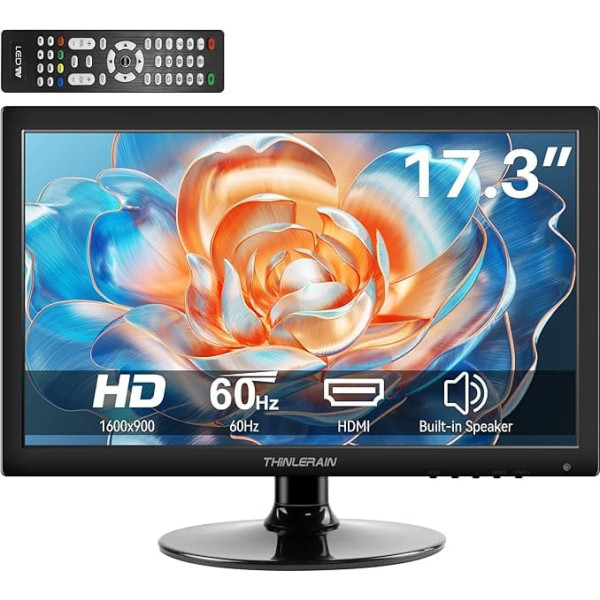 Wide range of uses - Thinlerain 17 inch monitor can be used as a second screen for expansion, DIY projects, as an external screen for game consoles, as a screen for playing video boxes or simply for video surveillance/data control. LED screen - The PC display with a resolution of 1600x900 and 97% sRGB colour space for defined images and true-to-life colour representation. Perfect for working in the office. Brightness: 250cd/m² | Refresh rate: 60Hz. Switching the input mode via the remote control/button, high sensitivity, strong interference resistance (the remote control does not contain battery). Various types of inputs - Supports many types of inputs and outputs: VGA, HDMI, USB inputs, meet your needs for connecting different devices with different output ports. BUILT-IN DUAL SPEAKERS - Equipped with built-in dual speakers, no need for separate external speaker units, no hassle with extra cables or setup procedures, this monitor with built-in speakers provides an all-in-one solution. › See more product details; Product description Thinlerain 17.3 inch monitor HDMI VGA 1600 x 900 LCD screen; Product description Thinlerain 17.3 inch monitor HDMI VGA 1600 x 900 LCD screen; Thinlerain 17.3 inch monitor HDMI VGA 1600 x 900 LCD screen