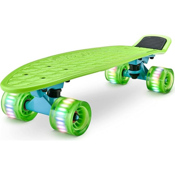 LED lights for safety and fun: our skateboard, suitable for beginners and advanced users of all ages, combines fun and safety with bright LED light wheels for increased visibility at night and impressive tricks. Optimised for any terrain: equipped with double kicktails and 60 x 45 mm PU wheels (PU cast HR 85a) with ABEC-7 bearings, this penny board offers a smooth driving experience on skate parks, ramps and even rough surfaces. Robust construction for maximum stability: with a durable and non-slip 55 x 14.5 cm PP deck and 8.3 cm aluminium trucks, the mini skateboard is designed for fast speeds and load capacity up to 100 kg, ideal for dynamic driving manoeuvres. High ride control thanks to premium equipment: the mini cruiser skateboard improves safety and control over the board with its non-slip grip tape and manoeuvr-friendly asymmetrical kicktails, making it a top choice for skaters of all levels. Ready to use without assembly: delivered fully assembled, our adult and children's skateboard combines functionality with comfort. It is immediately ready for the next adventure, makes it easy to carry, store and is the ideal gift for skateboard enthusiasts. › See more product details