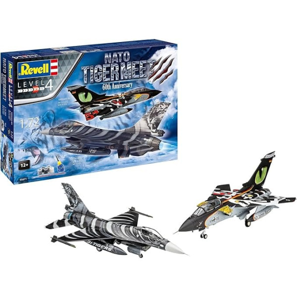Historical Tiger Meet Design: The set contains two model kits of the Tornado and F-16 Mlu fighter aircraft in the historic Tiger Meet design. These spectacular aircraft paintings with the distinctive tiger head in the crest are a trademark of the NATO Tiger Meet, which has taken place since the first meeting in 1961. Detailed kits: the models have been designed with great care and attention to detail. The F-16 MLU Tigermeet has a length of 20.7 cm and a wingspan of 14.3 cm, while the Tornado Tigermeet has a length of 24.3 cm and a wingspan of 20.1 cm. Each component has been precision engineered to ensure the authentic representation of the aircraft. Includes accessories: in addition to the model kits, the set also includes basic paints, glue and brushes. This gives you everything you need to start building the models immediately. The colours included allow you to faithfully recreate the Tiger Meet paintwork and give the models a realistic look. Anniversary set and poster: this set celebrates the 60th Anniversary of the NATO Tiger Meet. In addition to the two model kits, it also includes a poster showing the history and impressive designs of the Tiger Meet. The poster is a great addition for collectors and enthusiasts interested in military aircraft and their history. Authentic representation: the set allows you to recreate two different versions of the planes in Tiger Meet design. The F-16A MLU FA-87 of the 31st Season of the Belgian Air Force at NATO Tigermeet 2009 as well as the Tornado IDS 45+06 \