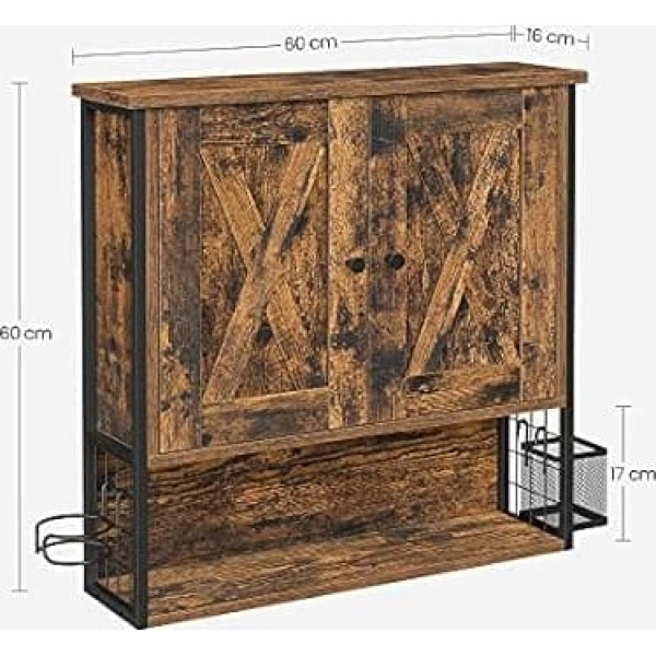 VASAGLE Bathroom Cabinet, Bathroom Cabinet, Wall Cabinet, Storage Cabinet, with 2 Doors, Adjustable Shelves, with Hairdryer Holder, Industrial Design, Vintage Brown/Black BBK123B01