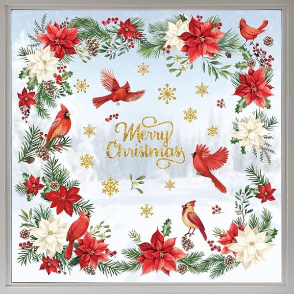 wondever Window Sticker Christmas Flowers Cardinal Birds Window Sticker Christmas Flowers Leaves Window Stickers Anti-Collision Double-Sided Glass Sticker Christmas Decoration