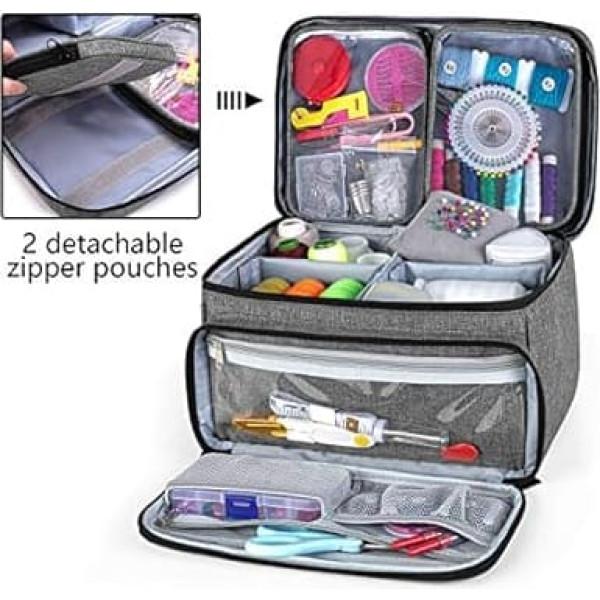 PROTECTION: The sewing kit bag is made of durable nylon, which is scratch resistant and durable. The padded lining in the bag protects your sewing tools during transport (accessories not included). LARGE CAPACITY: The main compartment of the sewing bag has 3 removable, padded dividers for organising wool (up to 5.11 inches). The lid has 2 removable clear zip pockets for storing needles, scissors and other sewing accessories. It also contains 1 pin cushion. FRONT POCKET The front pocket with 2 zipper pockets and 2 mesh pockets provides enough space for your sewing tools such as tape measure, scissors, etc. Easy to carry: attached with a reinforced handle for easy carrying. Dimensions: 27 x 17 x 18 cm (sewing accessory bag). 16.5 x 12.5 x 2 cm (transparent bag). Ideal for sewing enthusiasts, beginners, travellers, sewing classes, etc. › See more product details