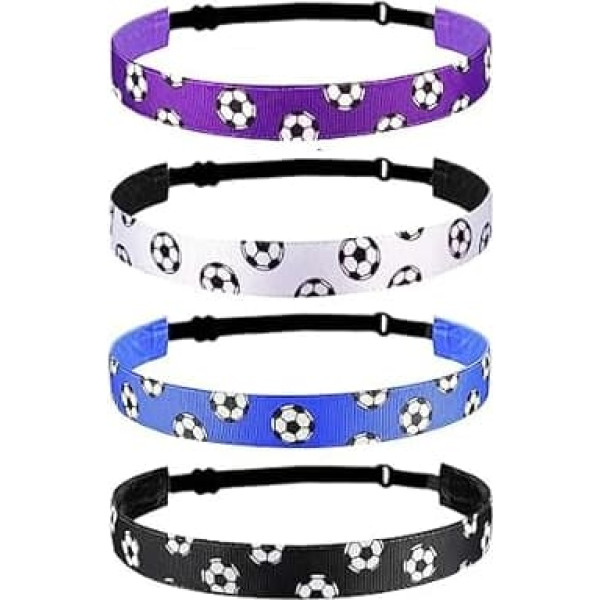 4 pieces per order girls' headband; size: 2.5 cm x 24 cm (width x length); colour: blue, white, purple and black. This football headband is made of polyester, a kind of material that is soft and skin-friendly, comfortable to wear. The inside of the headband has a thin velvet to increase the anti-slip effect, which can fix the hair band well and help you find a suitable position. Each headband comes with an elastic band and a buckle that can be adjusted to your head circumference to provide an excellent wearing experience. Very suitable for various sports such as running, football, sports and other activities, makes you look more energetic, can also be used as a gift for people who love sports. › See more product details; Product description Pack of 4 girls' hair bands. Size: 2.5 cm x 24 cm (W x L) Colour: blue, white, purple and black.; Product description Pack of 4 girls' hair bands. Size: 2.5 cm x 24 cm (W x L) Colour: blue, white, purple and black.; Pack of 4 girls' hair bands. Size: 2.5 cm x 24 cm (W x L) Colour: blue, white, purple and black.