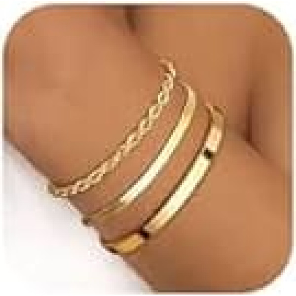 Finrezio 3-5 Pieces Women's Gold 14 Carat Gold-Plated Stacking Bracelets Stainless Steel Figaro Beads Chain Bracelets Adjustable Bracelet Set Waterproof Gold Jewellery for Women
