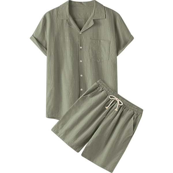Celucke Two-piece men's linen suit, summer leisure suit, plain 2-piece short sleeve, button down lapel shirt and shorts, festival outfit, beach linen shirt, short trousers set, cotton linen suit