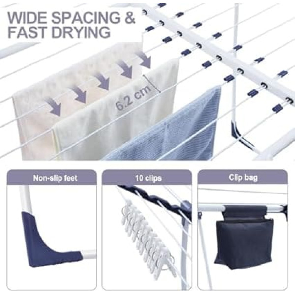 【Maximized Drying Space】Our clothes airer measures 160 x 45 x 85.6 cm with 24 hanging rods, 10 clips and 1 clip bag. Efficient drying with 6.18 cm spacing maximizes your drying space and accommodates all types of clothes Expandable design: with its expandable design, this wing clothes airer can be easily extended from compact 97 cm to generous 160 cm when unfolded. Say goodbye to confined washrooms and enjoy optimal space to hang your garments Multifunctional: our clothes airer with 2 folding wings, which can all be opened and closed, measures 32.5 x 8.6 inches and is designed for hanging smaller items, then wrapped for hanging smaller items, providing 4 drying areas for clothes, dresses, towels, pillows, socks and more Folds flat for easy storage: With a foldable design of 98 x 55 cm, this extendable clothes airer fits seamlessly into any room. Thanks to its flat profile, it can be easily placed in tight spaces. Its compact and foldable structure makes storage a breeze Indoor and outdoor use: our rust-resistant tumble dryer is versatile both indoors and outdoors, whether on a balcony or in a garden, bathroom, or laundry room. It is practical for any environment and ensures that your clothes dry quickly and effectively. › See more product details; Product description SYKIARIOL Clothes Airer, Extendable Clothes Airer, Foldable Wing Clothes Airer for Indoor 10 Clips with Bag, Collapsible Space Saving Drying Rack for Clothes,; Product description SYKIARIOL Clothes Airer, Extendable Clothes Airer, Foldable Wing Clothes Airer for Indoor 10 Clips with Bag, Collapsible Space Saving Drying Rack for Clothes,; SYKIARIOL Clothes Airer, Extendable Clothes Airer, Foldable Wing Clothes Airer for Indoor 10 Clips with Bag, Collapsible Space Saving Drying Rack for Clothes,