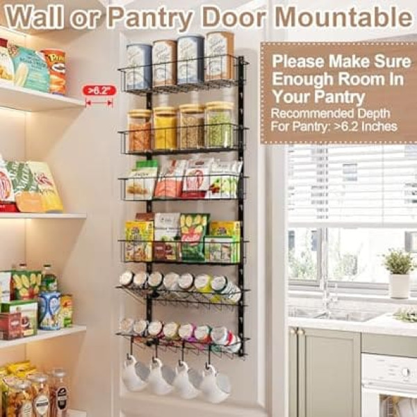 Spice Rack Wall Mount 6 Tiers with Hooks, Space Saving Spice Organiser for Spice Jars and Spices, Height Adjustable Hanging Spice Rack Storage for Kitchen Pantry