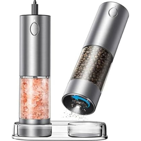 Large capacity: our electric salt and pepper grinder set offers a high capacity design that can grind up to 3.3 ounces of pepper with ease, making it perfect for individuals and large families Adjustable grinding settings: Equipped with 5 levels of adjustable coarseness settings, you can easily switch between fine and coarse grinder by simply turning the base. Settings are clearly marked with arrow indicators, allowing for precise control over grind size to suit your culinary needs RECHARGEABLE & SUSTAINABLE Our rechargeable salt and pepper grinder set features a Type-C charging cable for fast and convenient charging. With just one charge, it can be used for daily purposes for approx. one month, which contributes to a greener environment while saving money by eliminating disposable batteries Excellent Design Just press and hold the button of the pepper grinder with one hand to get fresh spices, and your other hand is free for other kitchen tasks. The built in LED light on the bottom ensures accurate grinding in all lighting conditions Electric salt and pepper mill set: Our salt and pepper mill is made of high-quality stainless steel, which is safe and durable. The set comes with a clear storage base that keeps your kitchen countertop tidy › See more product details