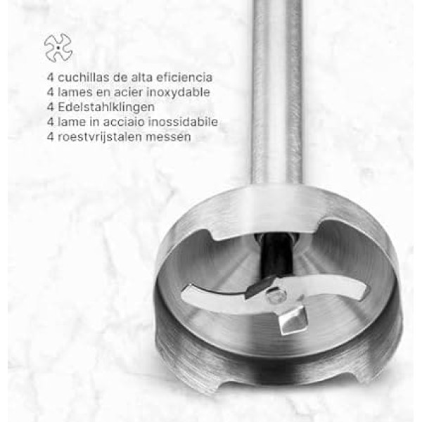 Performance: Hand blender with 1200 W motor, ideal for quickly and efficiently mixing, chopping and beating a variety of ingredients. Speed: 24 speed settings with turbo function for extra boost to guarantee perfect results every time you use it. Blades. 4 stainless steel blades ensure fast and even cutting and deliver a smooth and even texture in your preparations. Ergonomic and spray-resistant design. The ergonomic design ensures comfortable and safe handling, while the splash guard technology keeps your kitchen clean, allowing you to work efficiently and cleanly. Measuring cup. Includes measuring cup that facilitates preparation with accurate measurements and optimizes every step of your mixes. › See more product details