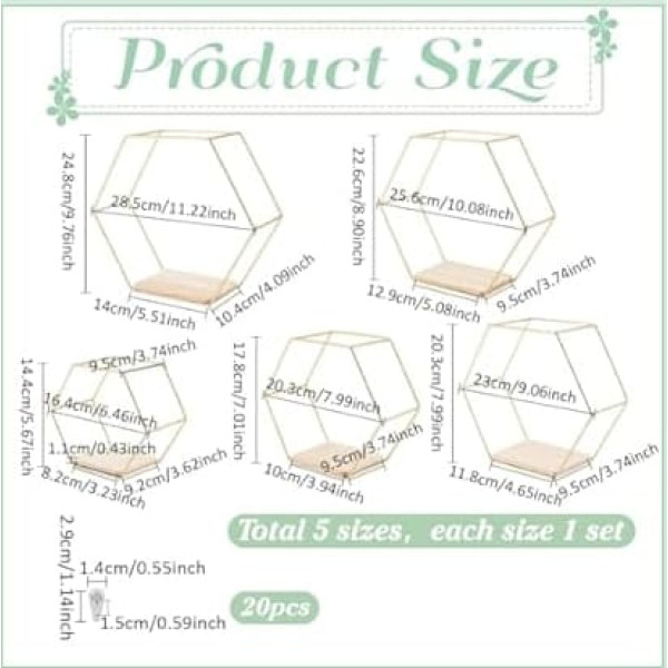 5 sizes: contains 5 different shelf sizes, size approx. 24.8 x 28.5 x 9.5 cm, 22.6 x 25.6 x 9.5 cm, 20.3 x 23 x 9.5 cm, 17.8 x 20.3 x 9.5 cm, 14.4 x 16.4 x 9.5 cm, can be used for placing different items Package includes: you will receive 5 pieces hexagonal shelves and 20 pieces hook nails, you can hang them in combination or individually in different places, which can give the room a unique geometric aesthetic Shelf with hook nails: you just need to attach the hook nails in the right place, then hang the shelves on the hooks to easily complete the installation, easy to use, add decoration and storage space to your wall Desktop decoration: you can also use it as a table decoration for flowers, aromatherapy and other items, and you can also decorate the metal border with plants and fabrics, which is perfect for making Christmas wreaths, wedding and party decorations Widely used: can be used in your bedroom, study, bathroom, living room and other areas for displaying ornaments, photos, paintings, figures, plants, perfumes, candles, souvenirs, books, jewellery and other items › See more product details; Product description PH PandaHall Hexagonal Floating Shelves You can use it as wall decor or to organize and display your photos, plants, books, embellishments, crafts and more. Size: Approx. 24.8x28.5x9.5cm , 22.6x25.6x9.5cm , 20.3x23x9.5cm , 17.8x20.3 x9.5cm , 14.4x16.4x9.5cm .; Product description PH PandaHall Hexagonal Floating Shelves You can use it as wall decor or to organize and display your photos, plants, books, embellishments, crafts and more. Size: Approx. 24.8x28.5x9.5cm , 22.6x25.6x9.5cm , 20.3x23x9.5cm , 17.8x20.3 x9.5cm , 14.4x16.4x9.5cm .; PH PandaHall Hexagonal Floating Shelves You can use it as wall decor or to organize and display your photos, plants, books, embellishments, crafts and more. Size: Approx. 24.8x28.5x9.5cm , 22.6x25.6x9.5cm , 20.3x23x9.5cm , 17.8x20.3 x9.5cm , 14.4x16.4x9.5cm .