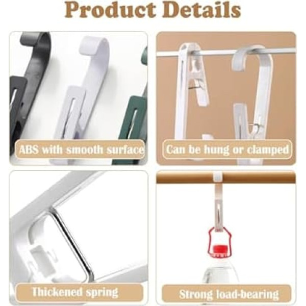 【Features】Large opening, strong clamping force, comfortable pressing. Made of ABS material, with built-in thick metal spring to ensure strong elasticity and prevent things from falling off. 2 Ways to Use: hook and clip in one, can be used to hang or fold over to attach items. The clothespin is 13.5 cm long and the maximum opening is approx. 1.7 cm. The hanging clips can be hung on a rod with a diameter of less than 3.5 cm or attached to a washing line with a diameter of less than 1.2 cm. Excellent material: the clothes pegs are made of high-quality ABS material, which is durable, corrosion resistant and does not fade easily. The thickened metal spring makes the bite force of the hanger clips stronger, making it less likely to fall off. NON SLIP GRIP TEETH Non-slip grip teeth of the towel clips increase friction and load capacity, which can hold items in place and prevent them from falling off easily. Perfect for hanging heavy wet towels, bath towels, bathrobes, wet swimsuits, etc. MULTIFUNCTIONAL The clothespins are perfect for hanging clothes, towels, oven mitts, dish gloves, shower curtains, bathrobes, shower caps, bath mats, socks, rain boots and more. It is suitable for various environments such as bathroom, kitchen, office, travel and outdoor activities, etc. › See more product details; Product description Product Features: Multifunctional clothespins: clothes pegs for hanging clothes, shower curtain hooks, boot hangers for closet, clothesline clips, clips for hangers, sock hangers, towel clip, travel clothes pins. ◆ Suitable rod types: rods with diameter less than 3.5 cm, such as shower curtain rods, towel rods, closet rods, metal rods for drying clothes, shower rods, etc. ◆ CLIP AND HANGING: The clips with hooks can be used as a clip or hook. You can turn it from the clip side to the hook side or turn it over to accommodate different bar thicknesses. Easy to Use No need to drill holes in the wall, can be moved at any time, light weight and easy to carry. SPACE SAVING Heavy duty clothespins can help you organize your items and keep your room organized.; Product description Product Features: Multifunctional clothespins: clothes pegs for hanging clothes, shower curtain hooks, boot hangers for closet, clothesline clips, clips for hangers, sock hangers, towel clip, travel clothes pins. ◆ Suitable rod types: rods with diameter less than 3.5 cm, such as shower curtain rods, towel rods, closet rods, metal rods for drying clothes, shower rods, etc. ◆ CLIP AND HANGING: The clips with hooks can be used as a clip or hook. You can turn it from the clip side to the hook side or turn it over to accommodate different bar thicknesses. Easy to Use No need to drill holes in the wall, can be moved at any time, light weight and easy to carry. SPACE SAVING Heavy duty clothespins can help you organize your items and keep your room organized.; Product Features: Multifunctional clothespins: clothes pegs for hanging clothes, shower curtain hooks, boot hangers for closet, clothesline clips, clips for hangers, sock hangers, towel clip, travel clothes pins. ◆ Suitable rod types: rods with diameter less than 3.5 cm, such as shower curtain rods, towel rods, closet rods, metal rods for drying clothes, shower rods, etc. ◆ CLIP AND HANGING: The clips with hooks can be used as a clip or hook. You can turn it from the clip side to the hook side or turn it over to accommodate different bar thicknesses. Easy to Use No need to drill holes in the wall, can be moved at any time, light weight and easy to carry. SPACE SAVING Heavy duty clothespins can help you organize your items and keep your room organized.