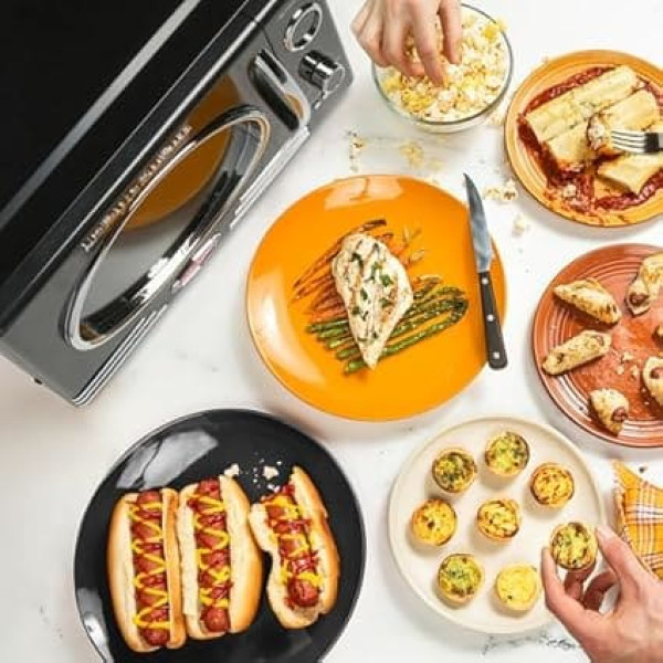 800 watt cooking power: with 25 litre capacity, this microwave provides the cooking power needed to cook and reheat food quickly. CUSTOMIZABLE COOKING PROGRAMMES: 12 pre-programmed cooking programs and a delay timer provide options for optimal heating of popular foods such as popcorn, pizza, potatoes, vegetables and more. Digital clock: the easy-to-read LED display illuminates the digital clock and highlights any cooking program. Even cooking: the rotating glass bowl ensures even heating of the food. RETRO DETAILS An elegant chrome door handle, control panel and accents add a special touch and style to this unique retro device. › See more product details; Product description With a beautiful and elegant retro design, this microwave will stand out in any kitchen. It has 12 pre-programmed cooking settings and a bright LED display that simplifies ease of use. 5 power levels and 800 watts of power are perfect for reheating leftovers or cooking food.; Product description With a beautiful and elegant retro design, this microwave will stand out in any kitchen. It has 12 pre-programmed cooking settings and a bright LED display that simplifies ease of use. 5 power levels and 800 watts of power are perfect for reheating leftovers or cooking food.; With a beautiful and elegant retro design, this microwave will stand out in any kitchen. It has 12 pre-programmed cooking settings and a bright LED display that simplifies ease of use. 5 power levels and 800 watts of power are perfect for reheating leftovers or cooking food.