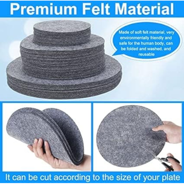 Total 96 pieces, 3 sizes: the package contains a total of 96 pieces felt protectors, which are available in three different sizes. Includes a small slotted spoon (9.5 x 5 inches), one medium slotted spoon (19 x 7.5 inches), one large skimmer (9.5 x 10.5 inches) High-quality felt material: the porcelain plate protector is made of soft felt material, which is very environmentally friendly and harmless to the human body, durable and reusable. It is foldable and washable for easy cleaning Protect the tableware: these felt tableware separators are ideal for protecting fine porcelain and cutlery when storing or moving and preventing scratches and peeling of plates or porcelain Easy to use: simply place a felt protector between pots and pans to avoid scratches, and it is easy to use and store. It is a great stacking and packaging product for plates, porcelain, glassware Housewarming gift: these felt cutlery protectors are so thick that you can even use these mats as pot holders to prevent the cutlery from damaging your countertops › See more product details; Product description Specification: Material: Felt Size: Small size 5\; Product description Specification: Material: Felt Size: Small size 5\; Specification: Material: Felt Size: Small size 5\