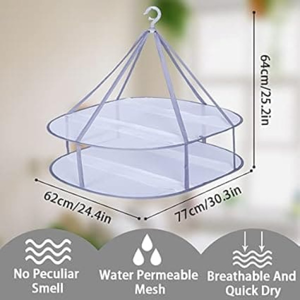 SNOMEL Foldable Mesh Clothes Airer Windproof with Fastening Strap Folding Hanging Clothes Airer for Sweater Feather Jacket Socks Outdoor Indoor Portable ENOUGH USED Preferred mesh and stainless steel ring material, strong and durable, large enough. FOLDABLE, PORTABLE, DURABLE: Easy to fold without tools, and folds flat for storage. Durable plastic hooks work on standard shower rods. Windproof Design The strong and serrated hook and fastening strap prevent slipping and blowing down by wind. Package Includes:1 x 2 Tier Foldable Clothes Airer › See more product details; Product description Sweater drying rack. Let them lie flat and dry easily in your home or garden. Description How to fold the drying rack 1. Lay the 2 layers flat. 2. Hold the edges of the narrow ends. 3. Turn them in opposite directions. Fold them into 3 small circles. 4. Fix it by the elastic band. Advantage: Windproof hook to lock the rack to the bar with 360° rotation. Polyester mesh is breathable and quick drying for better ventilation. Extra fixing tape protects clothes from blowing down by wind. Attention: Please keep a safe distance when you open the rack.; Product description Sweater drying rack. Let them lie flat and dry easily in your home or garden. Description How to fold the drying rack 1. Lay the 2 layers flat. 2. Hold the edges of the narrow ends. 3. Turn them in opposite directions. Fold them into 3 small circles. 4. Fix it by the elastic band. Advantage: Windproof hook to lock the rack to the bar with 360° rotation. Polyester mesh is breathable and quick drying for better ventilation. Extra fixing tape protects clothes from blowing down by wind. Attention: Please keep a safe distance when you open the rack.; Sweater drying rack. Let them lie flat and dry easily in your home or garden. Description How to fold the drying rack 1. Lay the 2 layers flat. 2. Hold the edges of the narrow ends. 3. Turn them in opposite directions. Fold them into 3 small circles. 4. Fix it by the elastic band. Advantage: Windproof hook to lock the rack to the bar with 360° rotation. Polyester mesh is breathable and quick drying for better ventilation. Extra fixing tape protects clothes from blowing down by wind. Attention: Please keep a safe distance when you open the rack.
