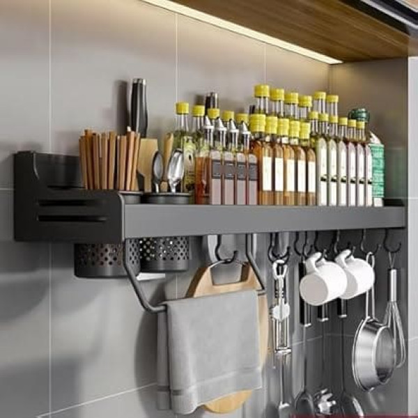 High-quality materials: our spice rack wall without drilling is made of high-quality metal and ABS. They will not rust and are corrosion resistant. Stable and durable, strong load capacity, long service life. Suitable for spices, salt, pepper, sugar, cooking oils, etc. Large capacity spice rack: size of the spice rack is 40 cm / 50 cm / 60 cm / 70 cm / 80 cm (L) x 14 cm (W) x 9.5 cm (H). It has enough space and is suitable for almost all standard spice jars. This multifunctional storage rack can also be used in bathrooms, pantry, doors, cupboards. Easy to install: There are two ways to install the spice rack without damaging the wall. You can either use the included dowels and screws, or you can attach the spice racks hanging with the included adhesive pads. This is quick and easy and should not be a problem for anyone. and removable. Extra functional accessories: the kitchen shelf is equipped with 2 hanging cups and 6 hooks, towel rail, 3 knife holders. Movable hook for hanging small things, hanging cups to hold brushes or small things. Space-saving: The hanging kitchen shelf does not take up too much space. You can place all your favourite herb and spice bottles conveniently and easily accessible, saving space on the kitchen worktop and keeping your kitchen clean and tidy. › See more product details