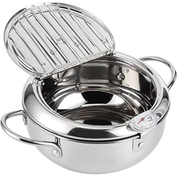 Fryer Pot, Stainless Steel Tempura Fryer in Japanese Style with Thermometer, Lid and Oil Drainer for French Fries, Shrimps, Fish (24 cm)