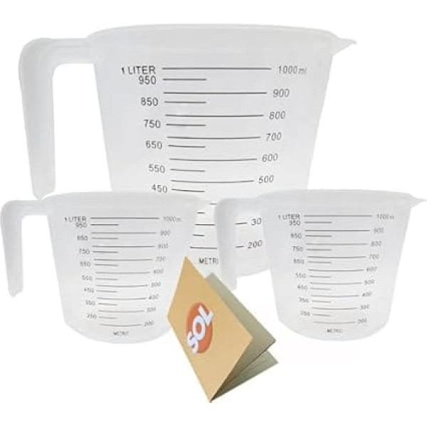 EASY TO USE - Our 3 plastic measuring cups have two measuring scales that are easy to read. The measurement on one side starts from 200 ml to 1000 ml with increments of 50 ml. The values are in a large black text and therefore also easy to read for people with visual problems. The other side has measurements in cups, ounces and quarts. HIGH QUALITY CRAFTSMANSHIP - Made of high quality plastic, our 1 litre measuring cup is durable, sturdy and strong. Unlike its cheaper counterparts, it is much more robust and will last longer. And if you are worried about it breaking when it falls, not because it is designed to withstand drops without breaking or breaking easily. LIGHTWEIGHT AND DURABLE - Our plastic measuring cup is lightweight and has a wide mouth making it easy to clean and use. The handle is ergonomically designed for an easy, comfortable grip and features a slight angle for easy pouring. GREAT Aesthetics - Our 1 litre plastic measuring cup has a sleek and smooth appearance and is ideal for use at home, restaurants, bars and parties. Whether cooking for your family or entertaining your friends, it does the job it is meant to do while looking good. You can even use it as a standalone decorative piece in the kitchen. INCLUDES SOL NOTEBOOK: An exclusive POCKET SIZE SOL notebook is included, measures 8.5cm x 12.5cm with 40 lined pages › See more product details