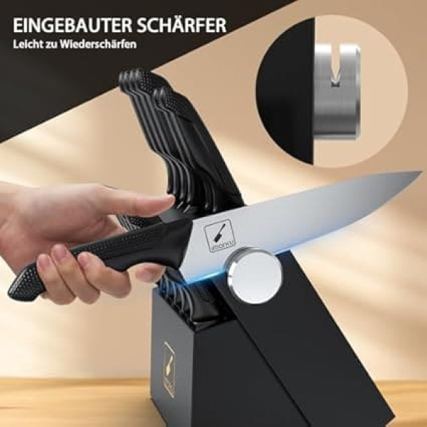 All-in-one knife set: do more in the kitchen with our 14-piece knife set with block, including 1 x chef's knife, 1 x santoku knife, 1 x bread knife, 1 x carving knife, 1 x paring knife, 1 x utility knife, 6 x steak knives, 1 x kitchen scissors and 1 x hardwood knife block with integrated sharpener. Each knife is neatly organized and ready to use Ultimate precision and durability: the imarku premium knife block set features ultra-sharp blades made of Japanese stainless steel that ensure effortless cutting and long service life. With an ergonomic design and integrated sharpener, our kitchen knife set is ideal for hobby chefs and professional chefs SAFETY AND COMFORT With a non-slip handle design for a comfortable, balanced grip that prevents accidental slipping, imarku knives are perfect for everyday use. Ergonomically curved design reduces hand strain and fatigue, making it practical and safe at the same time Easy to clean and maintain: with our dishwasher-safe knife set with block, cleaning up is a breeze. To maintain sharpness, we recommend quick rinsing and gentle hand washing. The knife block can be easily wiped clean to keep your storage area clean and tidy PERFECT GIFT FOR ANY OCCASION Surprise your loved ones with the gift of culinary expertise. Our beautifully packaged and quality tested kitchen knife set is perfect for any occasion including housewarming, birthdays, Valentine's Day, Father's Day, Mother's Day, Christmas or as a special treat for yourself. If you have any questions, our professional customer service is always there for you › See more product details