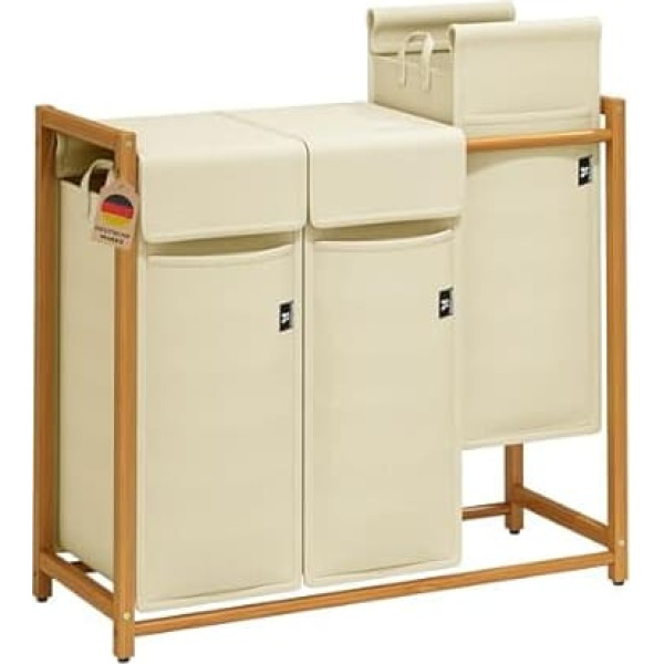 150 L laundry basket - Perfect for organised laundry storage. With 3 separate 50 L compartments, you can sort your laundry by colour, material or washing temperature. Ideal for families who want to separate their dirty laundry efficiently. Bamboo laundry sorter with breathable laundry bag. The 600D fabric laundry bag is removable, extendable and breathable. This ensures better air circulation and prevents unpleasant odours. Sustainable, stable & durable - High-quality bamboo frame. The frame is made of robust, sustainable bamboo with sturdy 2.5 x 2.5 cm side walls, which ensures a long service life and high load capacity. Space-saving & versatile design - Perfect for any home. Perfect for bathrooms, laundry rooms, bedrooms or children's rooms. Not only for laundry, but also for toys, towels or bedding. Quick assembly in just 15 minutes - Simple and stable. With the easy-to-follow instructions, the laundry basket can be set up in just 15 minutes - no additional tools required! Modern & elegant design - fits perfectly with any decor › See more product details