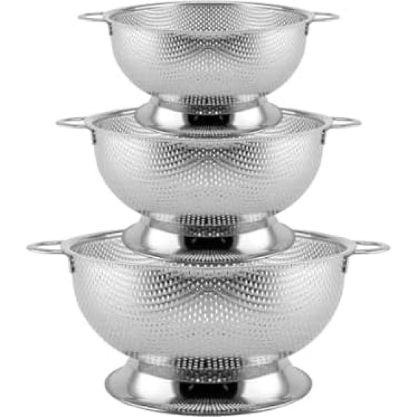 Durable construction – the kitchen sieve made of high-quality stainless steel is robust, rust-proof and designed for frequent use in the kitchen 3 sizes – this set contains three stainless steel strainers in different sizes: 28 x 10 cm, 22 x 11 cm and 19 x 9.6 cm, which offer versatile options for draining and rinsing various foods Efficient design – the raised base promotes air circulation and prevents food from standing in excess water, while the sturdy handles provide a secure grip for comfortable handling Versatile – perfect for draining and rinsing vegetables, fruit, pasta, rice and much more, making the stainless steel colander an indispensable tool for any kitchen Easy to clean – each stainless steel pasta strainer with base has precisely drilled perforations for quick and efficient draining. Dishwasher safe design allows for convenient cleaning and effortless maintenance after each use › See more product details
