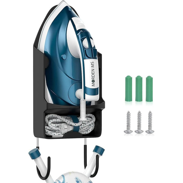 SPACE SAVING Maximize space and eliminate laundry room clutter with this clever wall mounted ironing board holder solution. With a wire storage slot at the bottom, the iron wire can be folded into the storage slot to save space and keep clean. Convenience Please use the included three screws to fix the ironing board to the wall or place where you need it. Keep ironing utensils handy and ready to use. Perfect for homes, hotels, bathrooms, laundry rooms and bedrooms. Premium Quality Our ironing board holder is made of durable PBT plastic, which is high temperature resistant up to 200 degrees. It also has strong hooks that can support a weight of more than 50 pounds, and can be used for hanging ironing boards or various small items. It can be easily cleaned by simply wiping with a damp cloth as needed. FITS MOST IRONS This iron and board holder is designed on the basis of most iron shapes. It fits most irons with a width of less than 13.2 cm, with ease. EASY TO INSTALL Please use the three included screws to fix the ironing board to the wall or where you need it. The hooks at the bottom are installed in the screw holes behind the hanger holder hanger for easy disassembly. When not in use, you can choose not to install it. › See more product details
