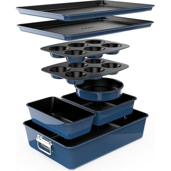 NutriChef Cake Baking Moulds – 8-Piece Stackable Non-Stick Baking Mould Set – PFOA, PFOS, PTFE Free, Oven Safe up to 232 °C – Round Cake Tin, Loaf Tin, Muffin, Tin Baking Tin, Dishwasher Safe
