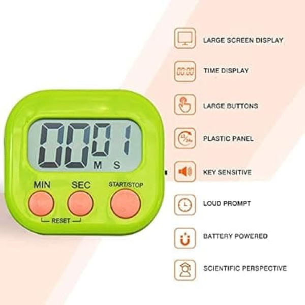 Two modes: the timers have two functions, countdown, and alarm. You can set different modes according to the actual situation. Can be used as a kitchen timer, kid timer, teacher timer, barbecue timer, fitness machine, SPA timer, hair salon timer, meeting timer, etc. Unique design: on the back of this timer there is a magnetic suction cup, which can be placed on a metal object such as a fridge door, etc., which is not easy to fall off. In addition to the magnetic suction piece, there is also a parallel holder design, which can be placed on the desk for easy reading of time. Versatile: the multifunctional timer is suitable for many occasions. It can take time and remind you of the arrival time of learning, exercise, meeting, kitchen. Remember in time, don't worry about missing time. Loud voice: the alarm sound is obvious, which can ensure that you can hear the sound in another room. You don't have to worry about missing the time during the cooking or lunch break. If you do not press it, the alarm time will last for 30 seconds. Colourful timer: there are four colours: white, lake blue, green and pink. Each colour can represent your different mood. The large LCD screen can read the time at any angle and in all lighting conditions. › See more product details