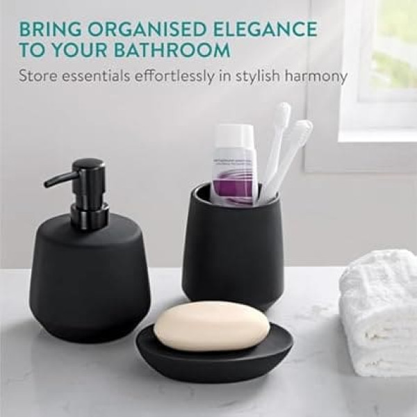 ENHANCED COMFORT The rubberized surface of our bathroom set provides a soft touch and non-slip grip. This bathroom accessory is ideal for anyone who values comfort. Elegant design: with its sleek, stylish and modern design, this bathroom accessory set is an asset to any bathroom equipment. The elegant black color adds a touch of sophistication. High-quality materials: our bathroom set is made of high-quality ceramic and finished with a rubber coating that provides additional protection against scratches. PERFECT ORGANIZATION This bathroom set is ideal for organizing bathroom utensils on the vanity top. The toothbrush holder can also be used to store makeup brushes. VERSATILE Our bathroom accessories set is not only practical but also decorative. The soap dispenser can also be used to store small jewellery items such as rings, necklaces and bracelets. › See more product details; Product description Elegant bathroom accessory set in black - indispensable bathroom accessories for a stylish ambience. Discover our exquisite bathroom accessory set, which consists of a soap dispenser, a toothbrush cup and other indispensable bathroom utensils. In a chic black, this bathroom accessory blends harmoniously into any bathroom equipment and gives your bathroom a touch of luxury. Our bathroom set is not only visually appealing, but also extremely functional and durable. Highlights: - Stylish Black - High-quality material. - Practical set. - Durable quality. Technical data: Dispenser dimensions: 10.3 x 10.3 x 15.7 cm; diameter: 10.3 cm. Soap dish dimensions: 13.2 x 9 x 2.5 cm. Toothbrush holder dimensions: 9 x 9 x 10.4 cm; diameter: 9 cm. Material: ceramic. Colour: black. Product information: 1 x soap dispenser. 1 x toothbrush holder. 1 x soap dish.; Product description Elegant bathroom accessory set in black - indispensable bathroom accessories for a stylish ambience. Discover our exquisite bathroom accessory set, which consists of a soap dispenser, a toothbrush cup and other indispensable bathroom utensils. In a chic black, this bathroom accessory blends harmoniously into any bathroom equipment and gives your bathroom a touch of luxury. Our bathroom set is not only visually appealing, but also extremely functional and durable. Highlights: - Stylish Black - High-quality material. - Practical set. - Durable quality. Technical data: Dispenser dimensions: 10.3 x 10.3 x 15.7 cm; diameter: 10.3 cm. Soap dish dimensions: 13.2 x 9 x 2.5 cm. Toothbrush holder dimensions: 9 x 9 x 10.4 cm; diameter: 9 cm. Material: ceramic. Colour: black. Product information: 1 x soap dispenser. 1 x toothbrush holder. 1 x soap dish.; Elegant bathroom accessory set in black - indispensable bathroom accessories for a stylish ambience. Discover our exquisite bathroom accessory set, which consists of a soap dispenser, a toothbrush cup and other indispensable bathroom utensils. In a chic black, this bathroom accessory blends harmoniously into any bathroom equipment and gives your bathroom a touch of luxury. Our bathroom set is not only visually appealing, but also extremely functional and durable. Highlights: - Stylish Black - High-quality material. - Practical set. - Durable quality. Technical data: Dispenser dimensions: 10.3 x 10.3 x 15.7 cm; diameter: 10.3 cm. Soap dish dimensions: 13.2 x 9 x 2.5 cm. Toothbrush holder dimensions: 9 x 9 x 10.4 cm; diameter: 9 cm. Material: ceramic. Colour: black. Product information: 1 x soap dispenser. 1 x toothbrush holder. 1 x soap dish.