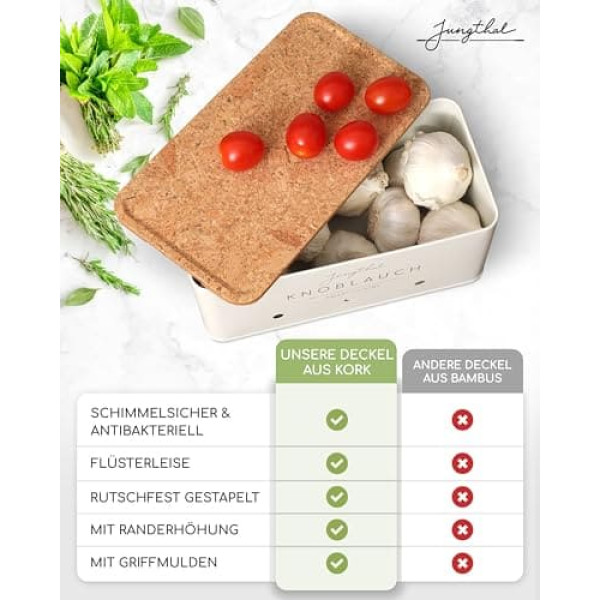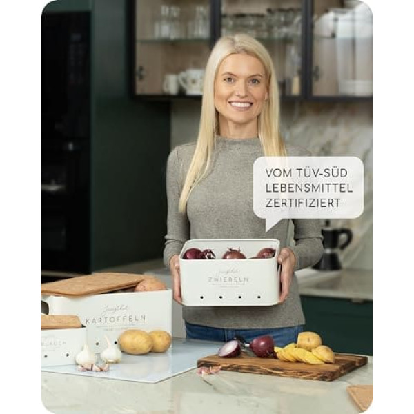 Cork lid: cork is naturally mildew proof and antibacterial - this supports optimal potato and onion storage even better. Tuber vegetables always love it dark, dry and well circulated. Cork is also 100% renewable and environmentally friendly. Innovative design: the potato storage box in a set with container for onions and garlic is perfectly matched in colour. The robust lids made of warm natural cork impress with their warm look and ensure slip resistance when stacking. Clever: the specially created lids have a raised rim. Perfect for use as a fruit and vegetable bowl. The velvety soft surface and side recessed grips also significantly increase comfort. Store potatoes with bonus! Safe quality: we pursue the highest standards in material and processing, so our storage containers are food-certified by TÜV Süd and meet the particularly high requirements for storing food. Timeless and practical: whether as an onion pot, potato box, potato container or potato box for storage; our storage container set is stackable, compact, robust and durable. The smooth, easy-care surface also ensures effortless cleaning. Decoration for the kitchen: storage for potatoes, onions and garlic can also look good. Whether in the pantry or in the vegetable shelf, our storage boxes do not need to hide and are therefore the perfect kitchen organiser. › See more product details