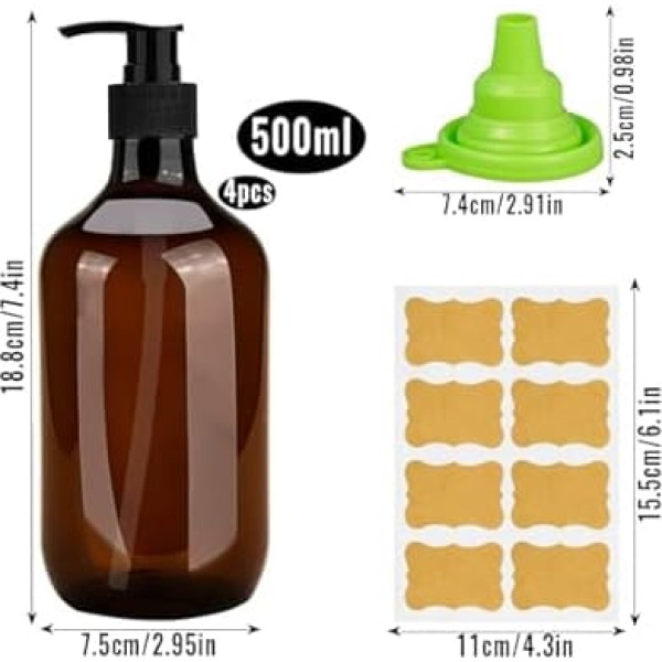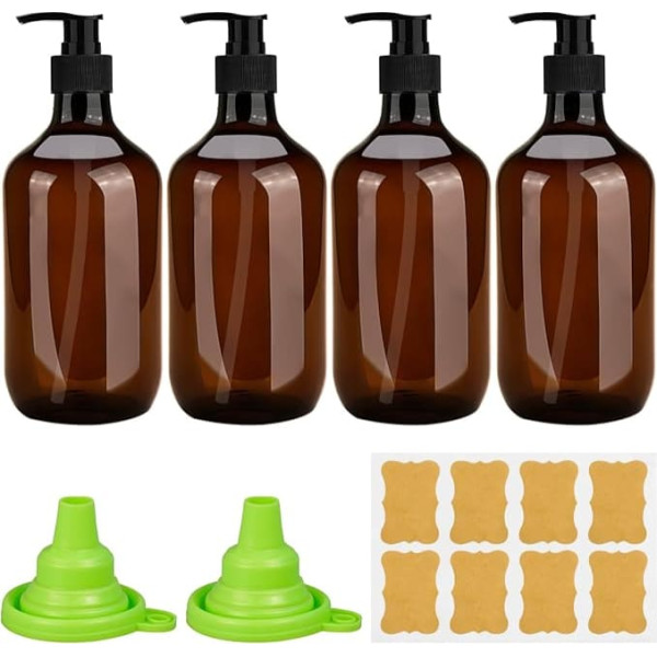 PACKAGE INCLUDES 4 x 500ml pump bottle dispenser, 2 x foldable funnels and 1 x label paper. Amber soap dispenser is retro and fashionable, suitable for different home styles, can effectively block UV rays and protect the soap components from photolysis. Premium material: the detergent dispenser is made of high-quality PET material, sturdy and durable, not easy to break, its surface is smooth and delicate, comfortable to touch, reusable and recyclable. Leakproof Design The bottle mouth adopts a threaded design, which is tightly sealed to ensure that the liquid will not leak even when reversed. The thickened groove bottom of the bottle is stable and drop-proof, bringing more peace of mind to your life. Easy to use: our hand soap dispenser uses a high-quality pressure pump that can release a reasonable amount of soap with a gentle squeeze. Labels can help you distinguish different liquid bottles; Funnel can distribute liquids quickly and smoothly, reducing overflow and waste. Wide applications: our liquid soap dispenser is perfect for dosing shampoo, conditioner, shower gel, detergent, detergent, lotion, essential oils and more. Suitable for various places such as bathroom, kitchen, hotel, travel and so on. Perfect for gifting. › See more product details; Product description 4 x 500 ml pump bottle; Product description 4 x 500 ml pump bottle; 4 x 500 ml pump bottle