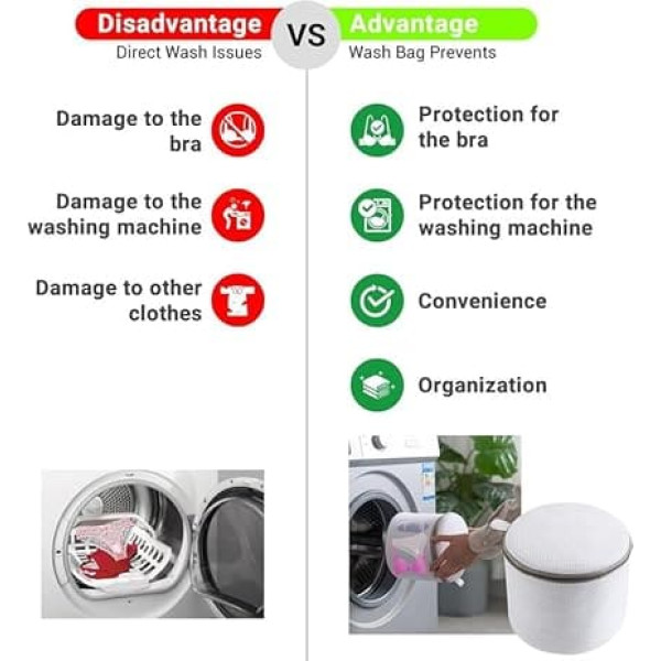 [Ultimate Protection for Bras and Delicates] With the mesh pocket as a protective barrier, your bras will not act on other garments in the wash. This reduces the risk of ruining your other delicate garments such as lace lingerie, stockings or sweaters. PREVENT DAMAGE TO WASHING MACHINE The wash bag keeps hangers and hooks securely in the bag during the wash cycle, minimizing the risk of bra parts loosening and causing damage to your washing machine. [Protect Bra Shape and Integrity] The bra wash bag acts as a protective shield and protects the delicate fabric and underwire of your bras. It ensures that bras retain their shape and prevent them from stretching, deforming or puncturing the underwire after washing. Organize your laundry and never lose socks again. Easily sort and store bras, lingerie and other delicate items, helps keep your laundry neat and organized. DURABLE & MACHINE WASHABLE Made of mesh fabric, this toiletry bag is designed to withstand repeated machine washes. Its durable construction ensures long-lasting use, making it the perfect choice for anyone looking to preserve their delicate garments and laundry equipment. CONVENIENT AND TIME SAVING No need to wash your bras by hand. Simply place them in the wash bag and let the washing machine do the work. It's a quick, easy way to maintain your delicates without any extra effort. › See more product details; Product description Product description: The bra wash bag is an essential solution to protecting your delicate lingerie when machine washing, ensuring your bras stay in top condition for longer. Made of high quality mesh, it serves as a barrier to prevent damage to fabric, elasticity and ironing of your bra, which can be easily affected by the hard movement of a typical wash cycle. The bag also prevents the underwire from breaking freely to ensure they stay securely in place while keeping your bras from snagging or damaging other garments in the machine. The bra wash bag not only protects your bras and clothes, but also protects your washing machine from possible damage caused by loosened hangers or hooks. It is a convenient, time-saving solution that allows you to wash your bras along with your normal laundry without worrying about hand washing, while keeping your laundry organized and efficient. Durable, reusable and easy to use. The bra wash bag is the perfect addition to your laundry routine, helping to preserve the shape and integrity of your lingerie, save time and protect your washing machine and other clothes from unnecessary wear and tear.; Product description Product description: The bra wash bag is an essential solution to protecting your delicate lingerie when machine washing, ensuring your bras stay in top condition for longer. Made of high quality mesh, it serves as a barrier to prevent damage to fabric, elasticity and ironing of your bra, which can be easily affected by the hard movement of a typical wash cycle. The bag also prevents the underwire from breaking freely to ensure they stay securely in place while keeping your bras from snagging or damaging other garments in the machine. The bra wash bag not only protects your bras and clothes, but also protects your washing machine from possible damage caused by loosened hangers or hooks. It is a convenient, time-saving solution that allows you to wash your bras along with your normal laundry without worrying about hand washing, while keeping your laundry organized and efficient. Durable, reusable and easy to use. The bra wash bag is the perfect addition to your laundry routine, helping to preserve the shape and integrity of your lingerie, save time and protect your washing machine and other clothes from unnecessary wear and tear.; Product description: The bra wash bag is an essential solution to protecting your delicate lingerie when machine washing, ensuring your bras stay in top condition for longer. Made of high quality mesh, it serves as a barrier to prevent damage to fabric, elasticity and ironing of your bra, which can be easily affected by the hard movement of a typical wash cycle. The bag also prevents the underwire from breaking freely to ensure they stay securely in place while keeping your bras from snagging or damaging other garments in the machine. The bra wash bag not only protects your bras and clothes, but also protects your washing machine from possible damage caused by loosened hangers or hooks. It is a convenient, time-saving solution that allows you to wash your bras along with your normal laundry without worrying about hand washing, while keeping your laundry organized and efficient. Durable, reusable and easy to use. The bra wash bag is the perfect addition to your laundry routine, helping to preserve the shape and integrity of your lingerie, save time and protect your washing machine and other clothes from unnecessary wear and tear.