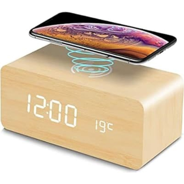 Alarm Clock LED Wooden Digital Alarm Clock with Wireless Charger Date Voice Control Indoor Temperature 3 Brightness 3 Alarm Settings for Home Bedroom and Office (Bamboo)