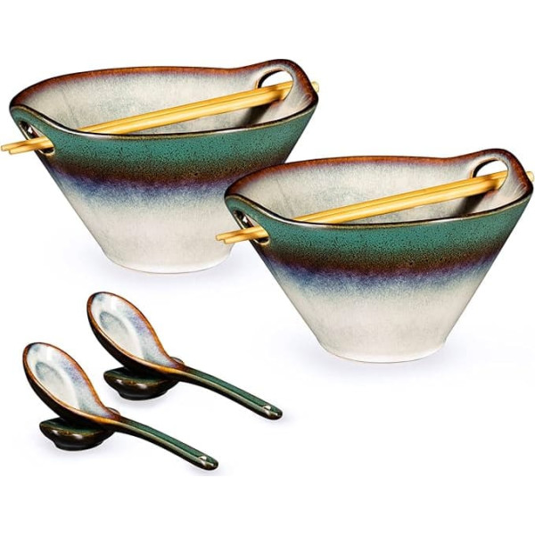 【8 Piece Set】A traditional Japanese ramen bowl set with 2 bowls, 2 spoons, 2 chopsticks and 2 stick holders. Each kit contains everything you need. With these beautiful ramen noodles in a multipack, your meals at home will feel like in a fine restaurant Distinctive design: 780 ml bowl with cut-out handles for easy carrying. Retro colours with innovative shapes to effectively stimulate your taste buds. Ideal for ramen, pasta, river pasta, udon, salads, soba, rice, cake, cereal, popcorn, oatmeal or soup dishes Beautiful and functional: the Asian style soup bowls have a beautiful glaze with colour gradient on the surface. The glaze is made at high temperatures, is free from harmful substances, non-adhesive and scratch resistant. Durable for everyday use yet easy to clean. Microwave, oven, dishwasher and refrigerator safe Great gift choice: these bowls are a must if you are looking for tableware that catches the eye. It is an ideal gift for any occasion, whether it's a party, housewarming, festival or holiday Quality products and services: HENXFEN LEAD specialises in ceramics, each product is rigorously tested and each package is carefully inspected. If you have a random problem with your package, please contact us directly and we will show you a quality service › See more product details